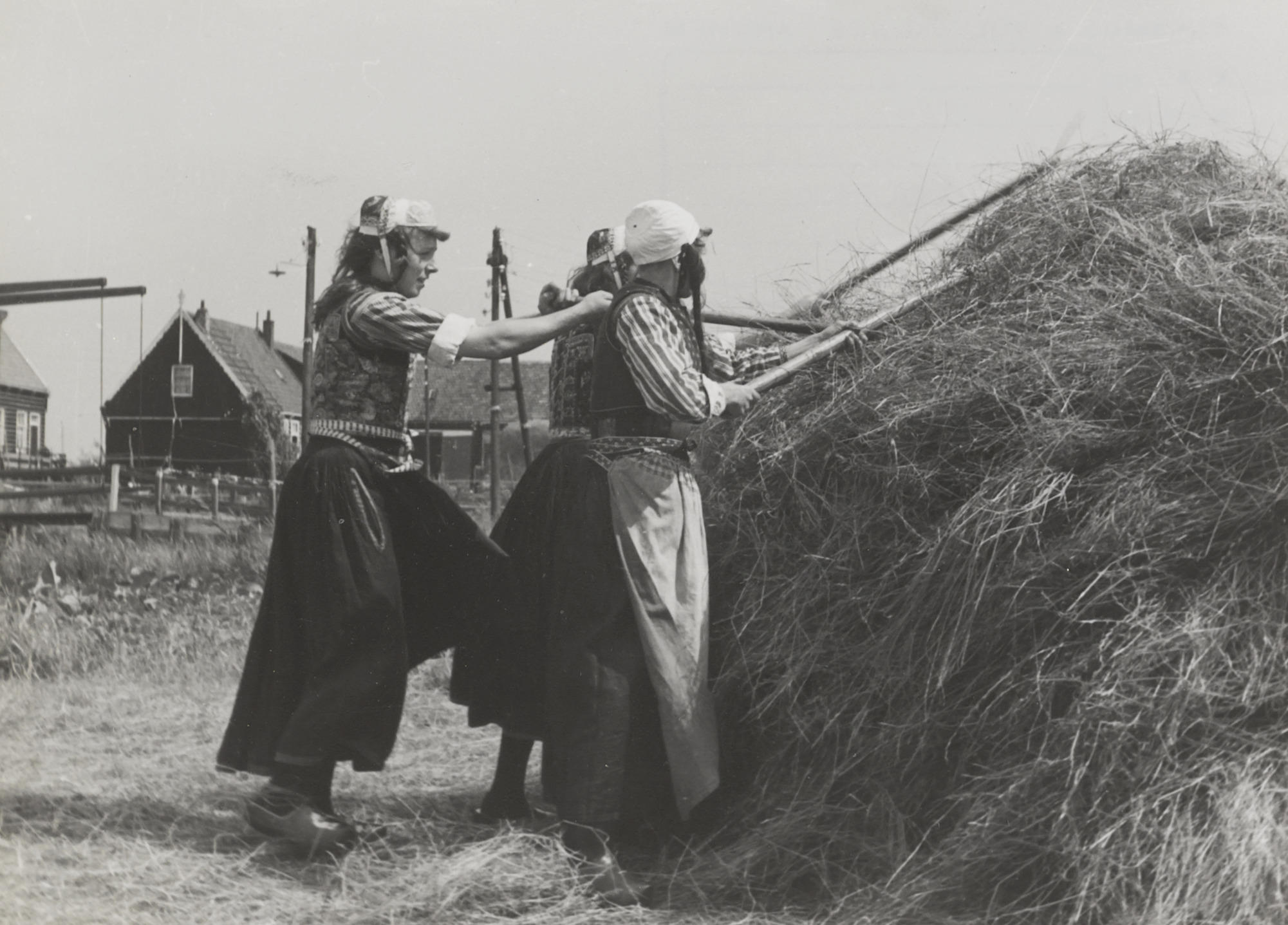 Meisjes aan het hooien op Marken. Ze zijn gekleed in Marker streekdracht.