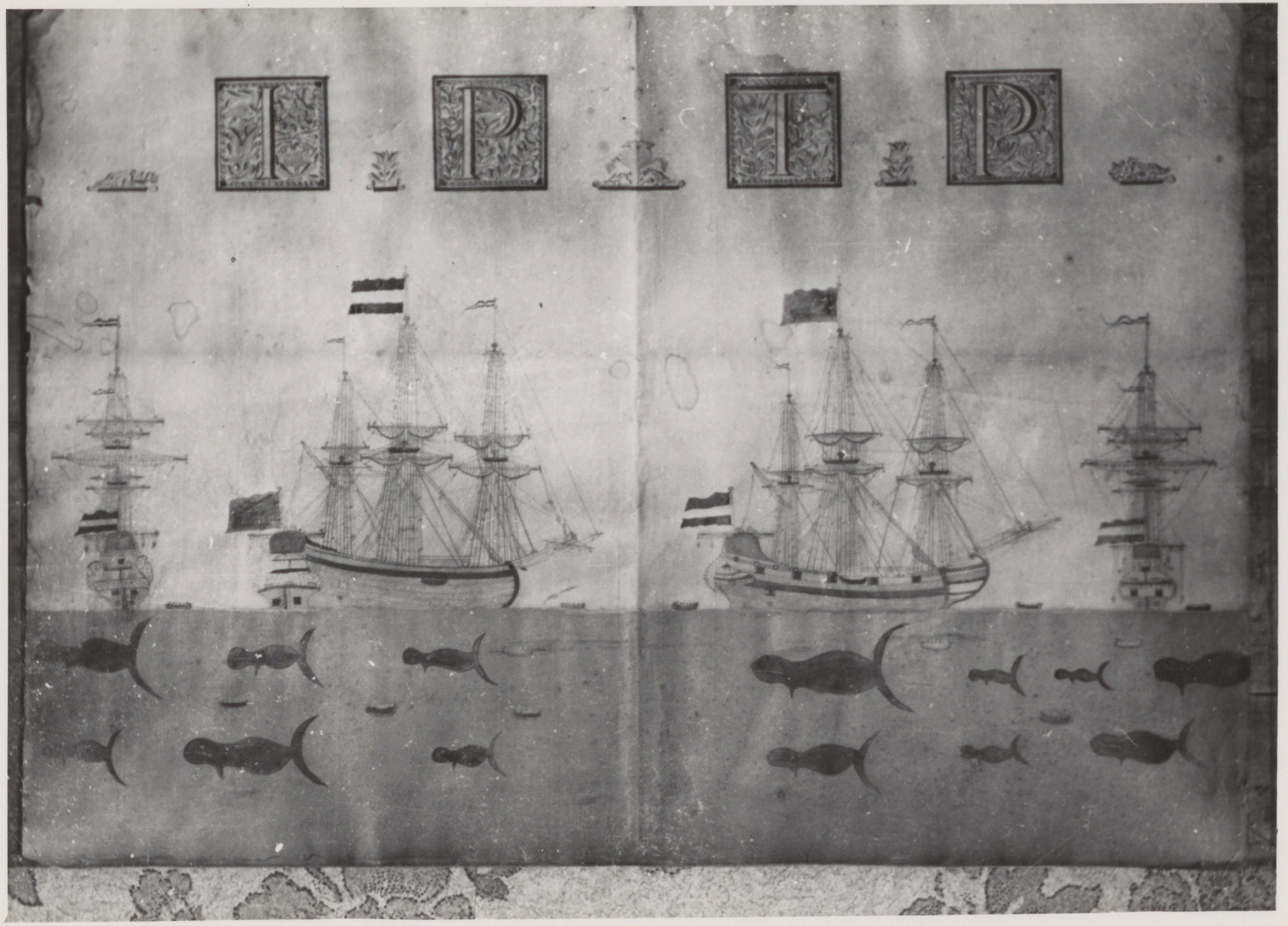 Aquarel met voorstellingen uit de walvisvaart en de initialen 'I.P.T.P.', gefotografeerd op Marken.