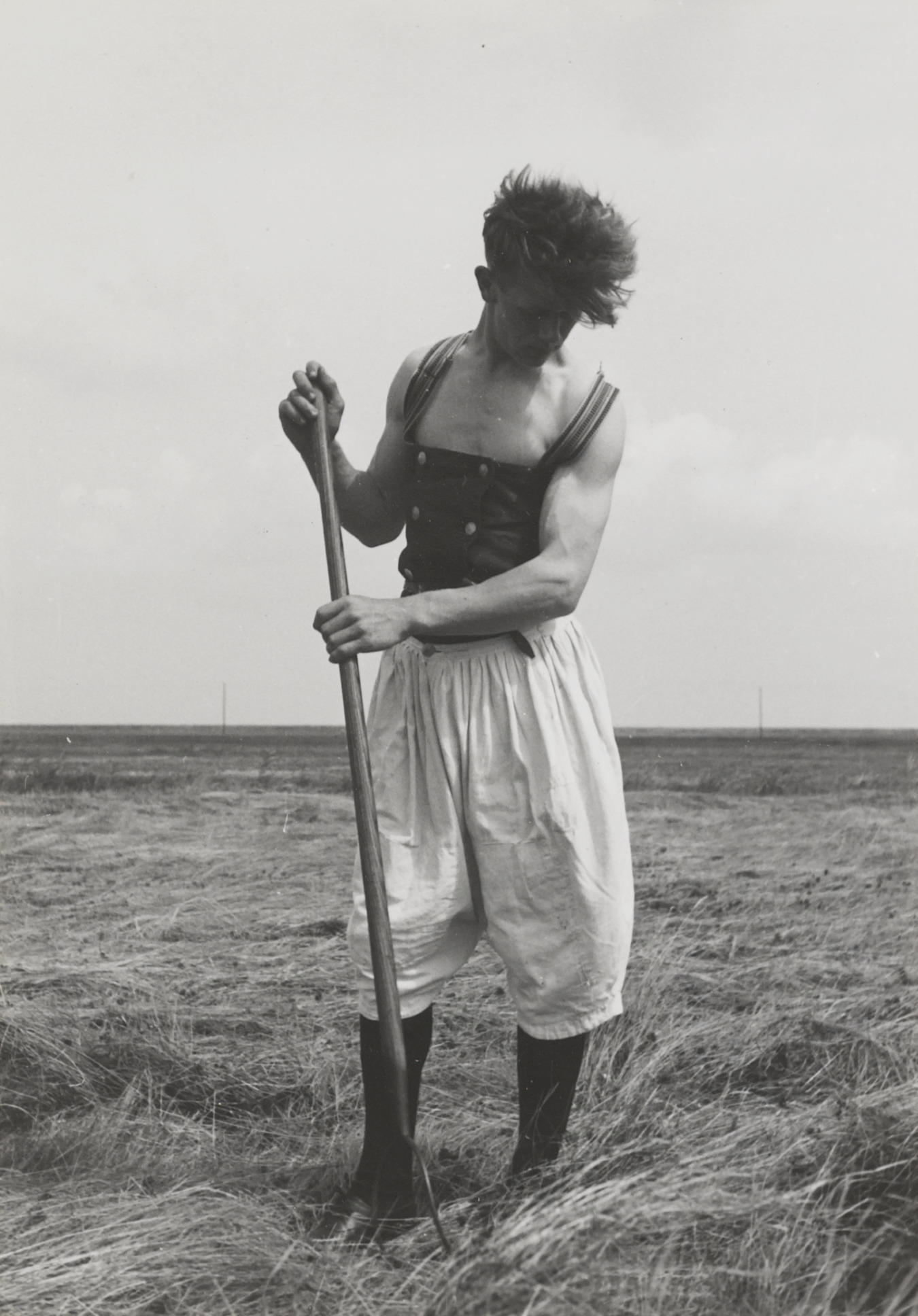 Pieter Kes aan het hooien, Marken, 1943 (zwart-wit foto)