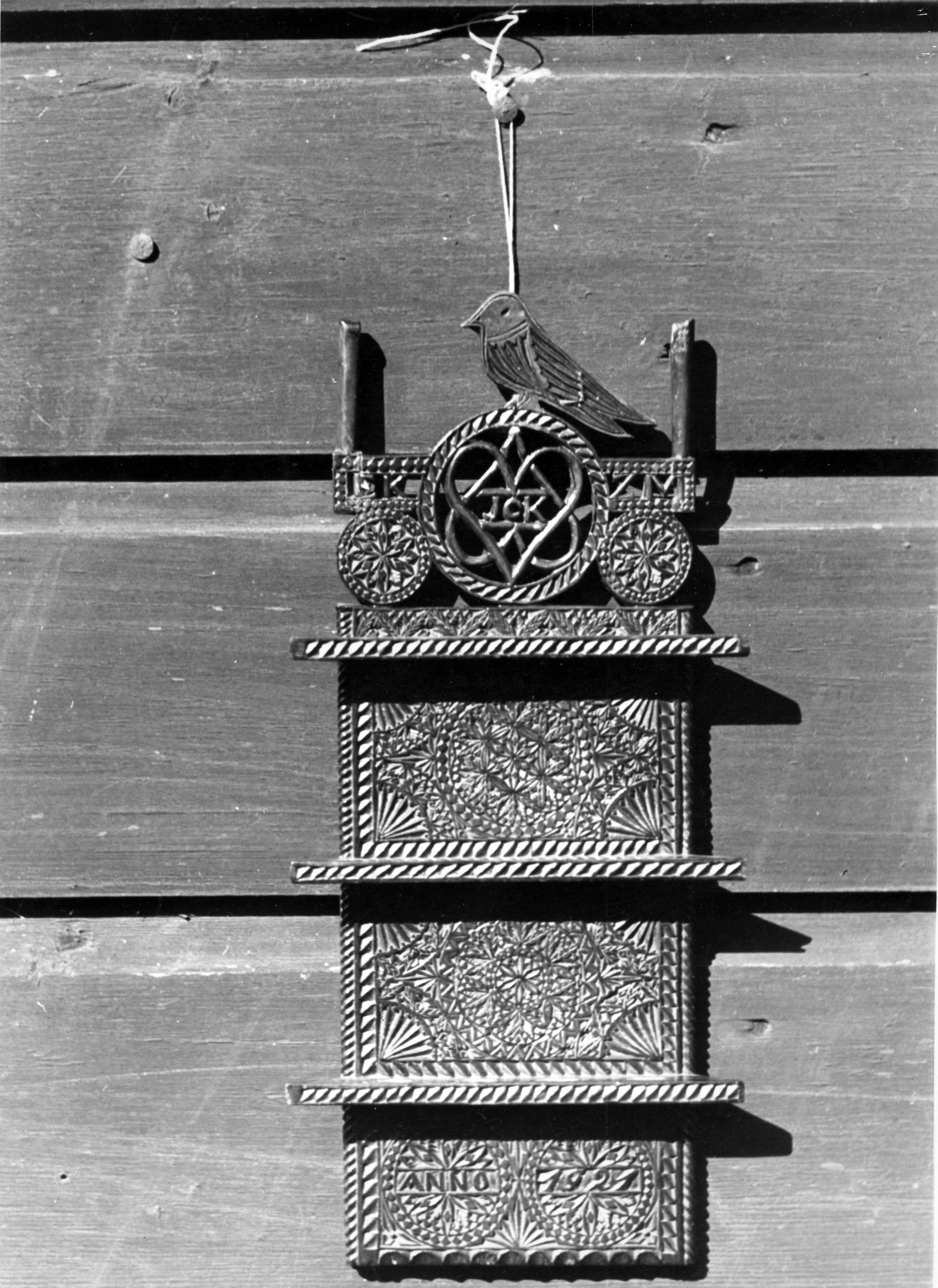 Lepelrek, versierd met houtsnijwerk, de datering 1921 en de initalen 'EK', 'ZM' en 'JCK'. Het rek is gefotografeerd op Marken.