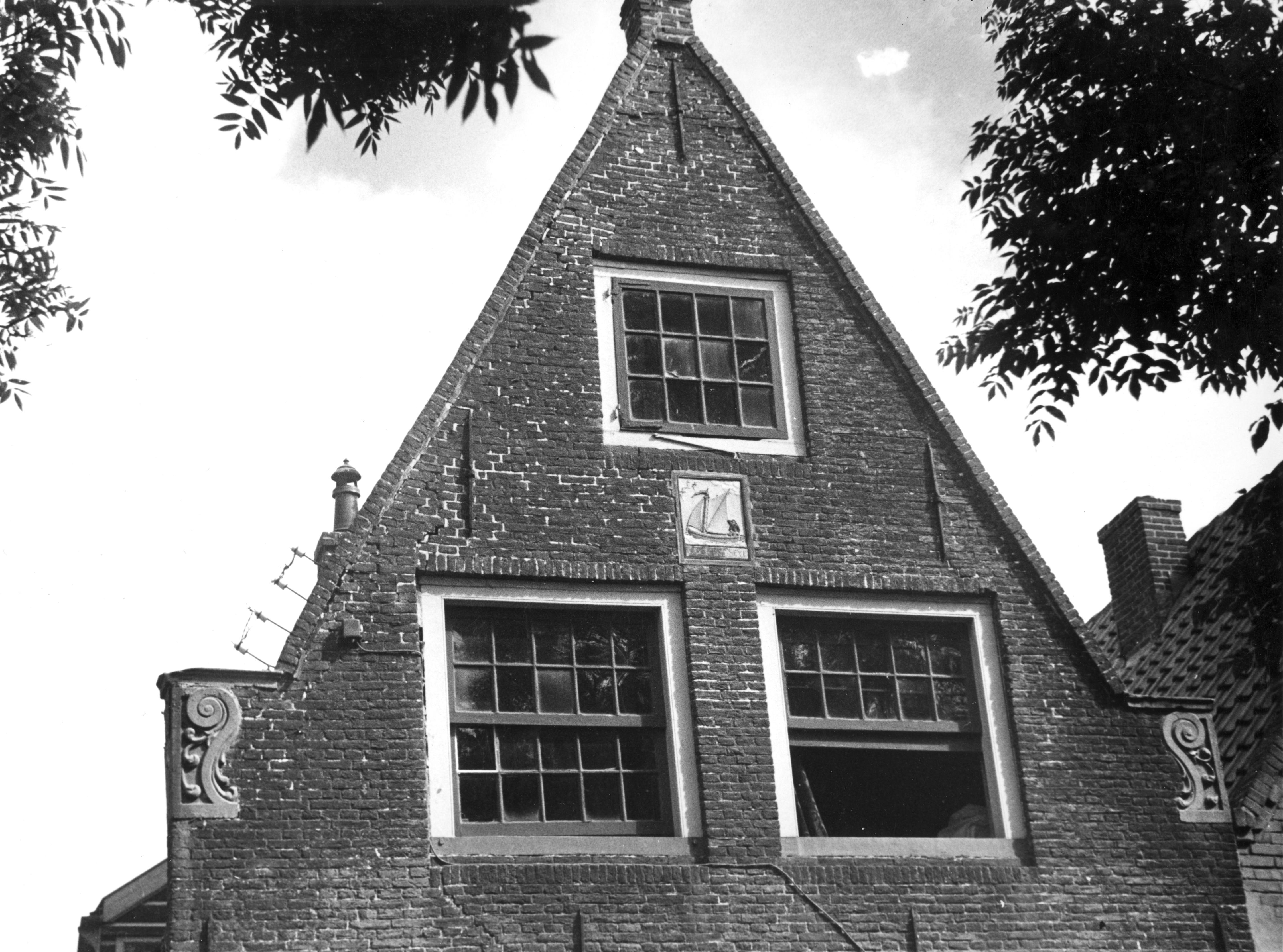 Gevel met gevelsteen, Edam, 1942 (zwart-wit foto)