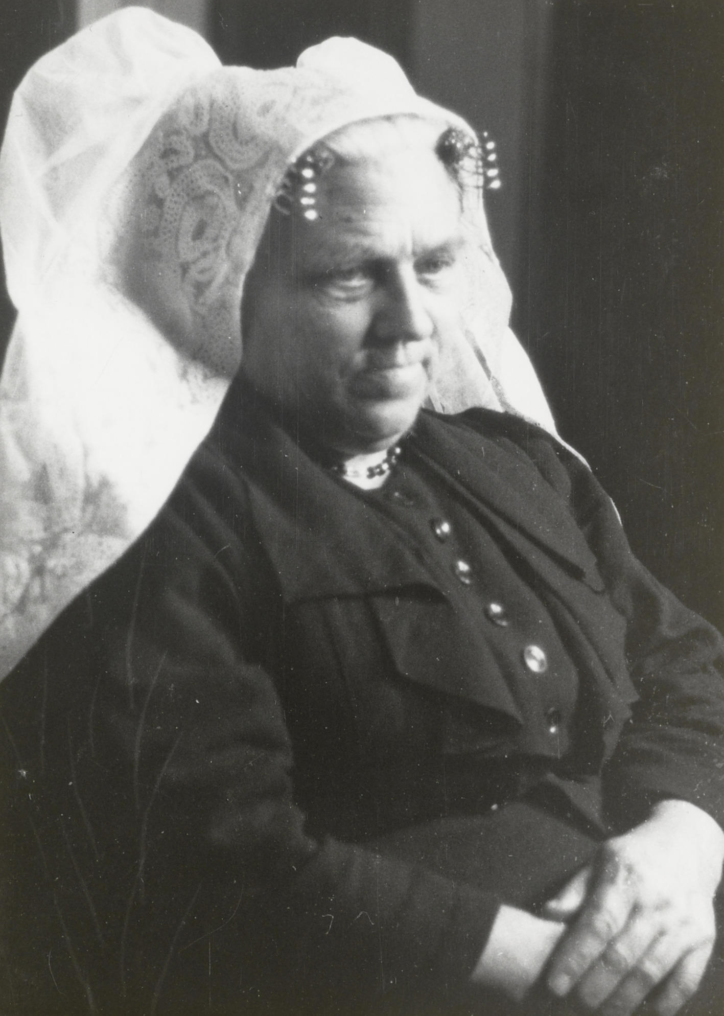 Vrouw in Noord-Bevelandse streekdracht, 1900-1939 (zwart-wit foto)