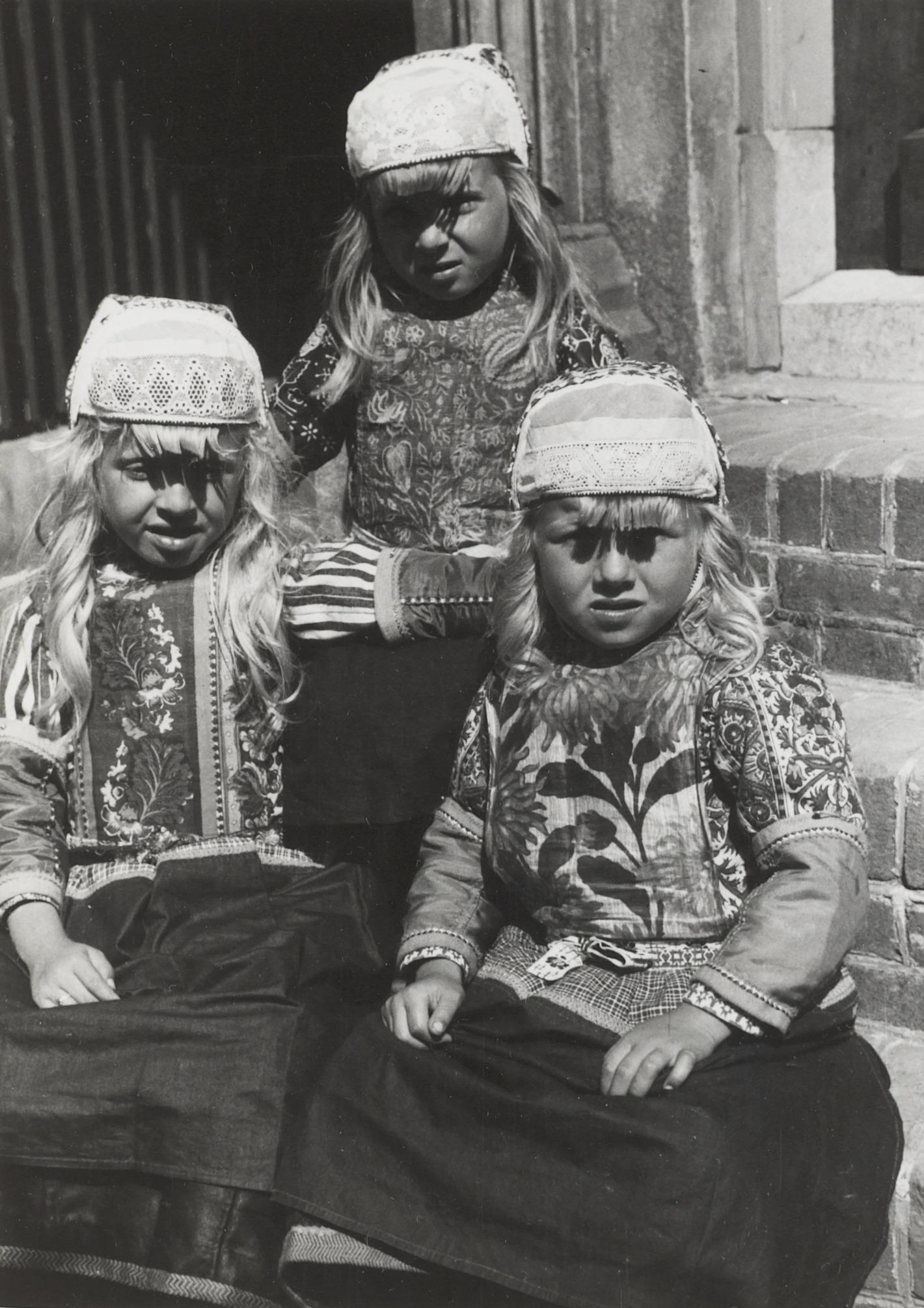 Drie meisjes in streekdracht van Marken, 1939 (zwart-wit foto)