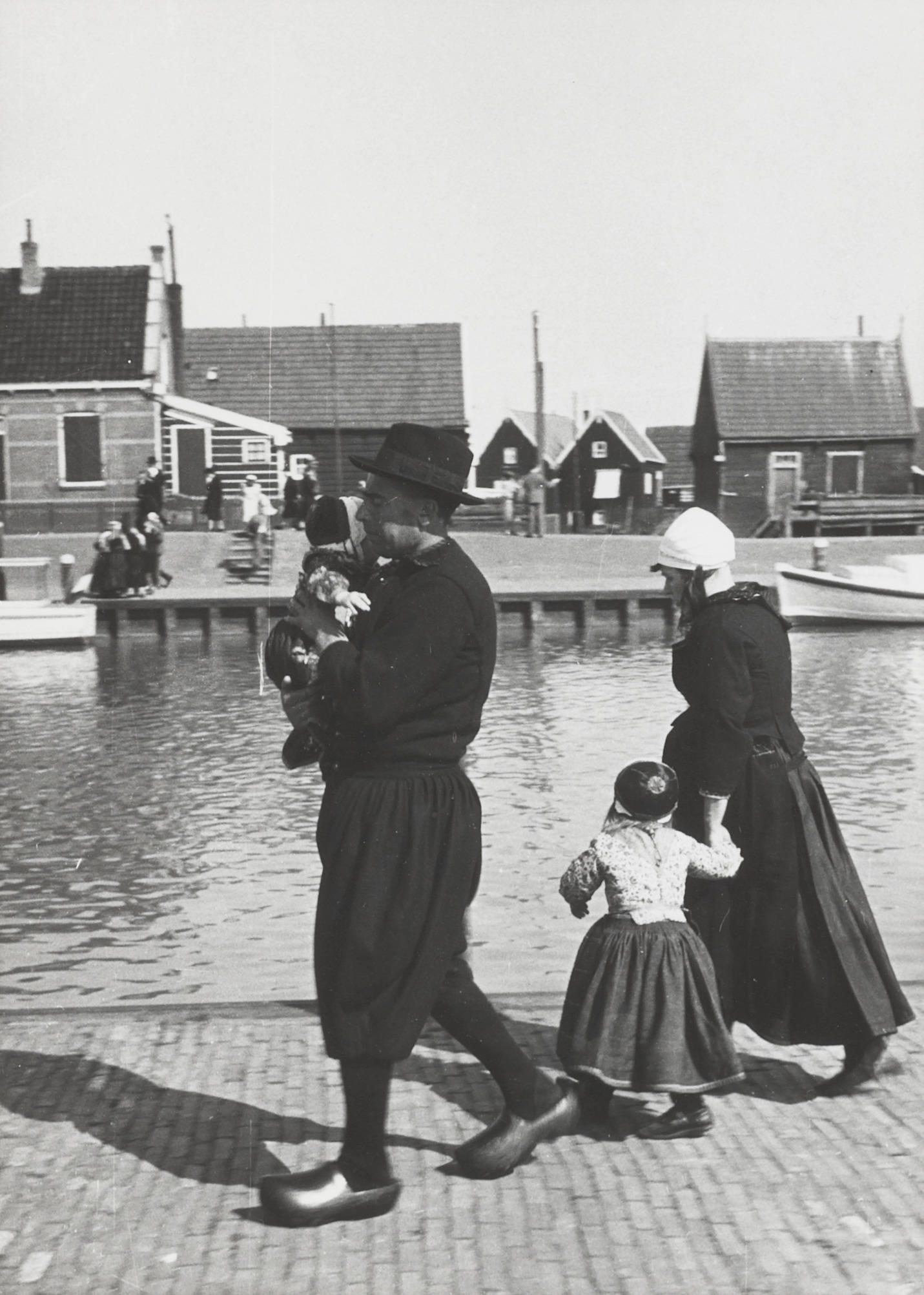Echtpaar en kinderen in Marker streekdracht. Het kind aan de hand van de vrouw is een jongen in rokkendracht. Hij is als jongen onder meer herkenbaar aan de twee pandjes aan de achterzijde van zijn jak.
