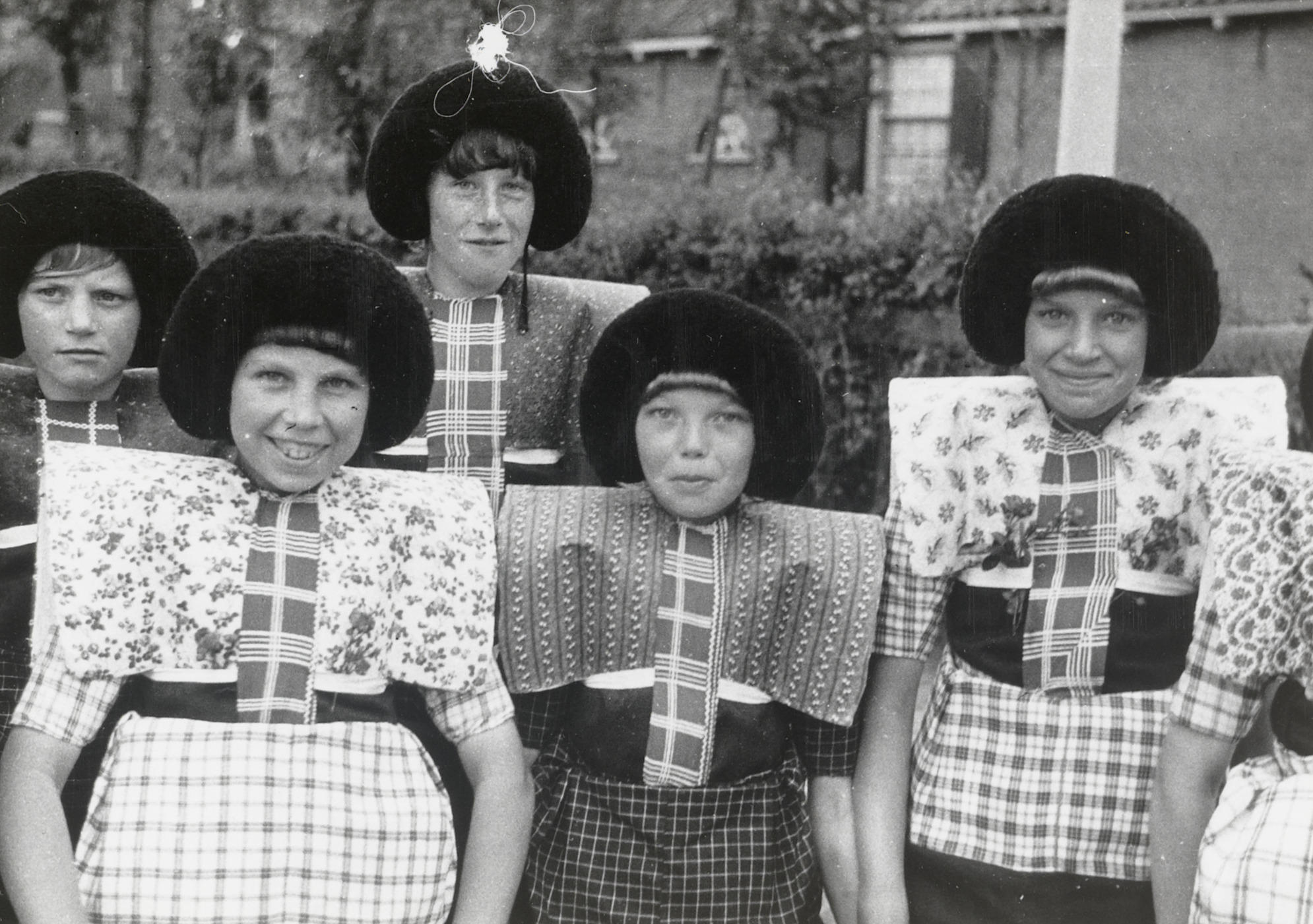 Meisjes in streekdracht van Spakenburg, 1938 (zwart-wit foto)