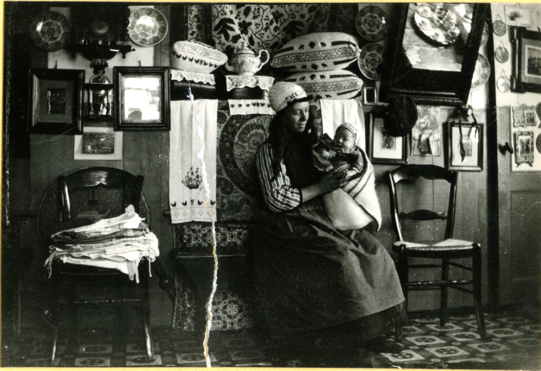 Vrouw en kind in Marker dracht in traditioneel interieur (zwart-wit foto)