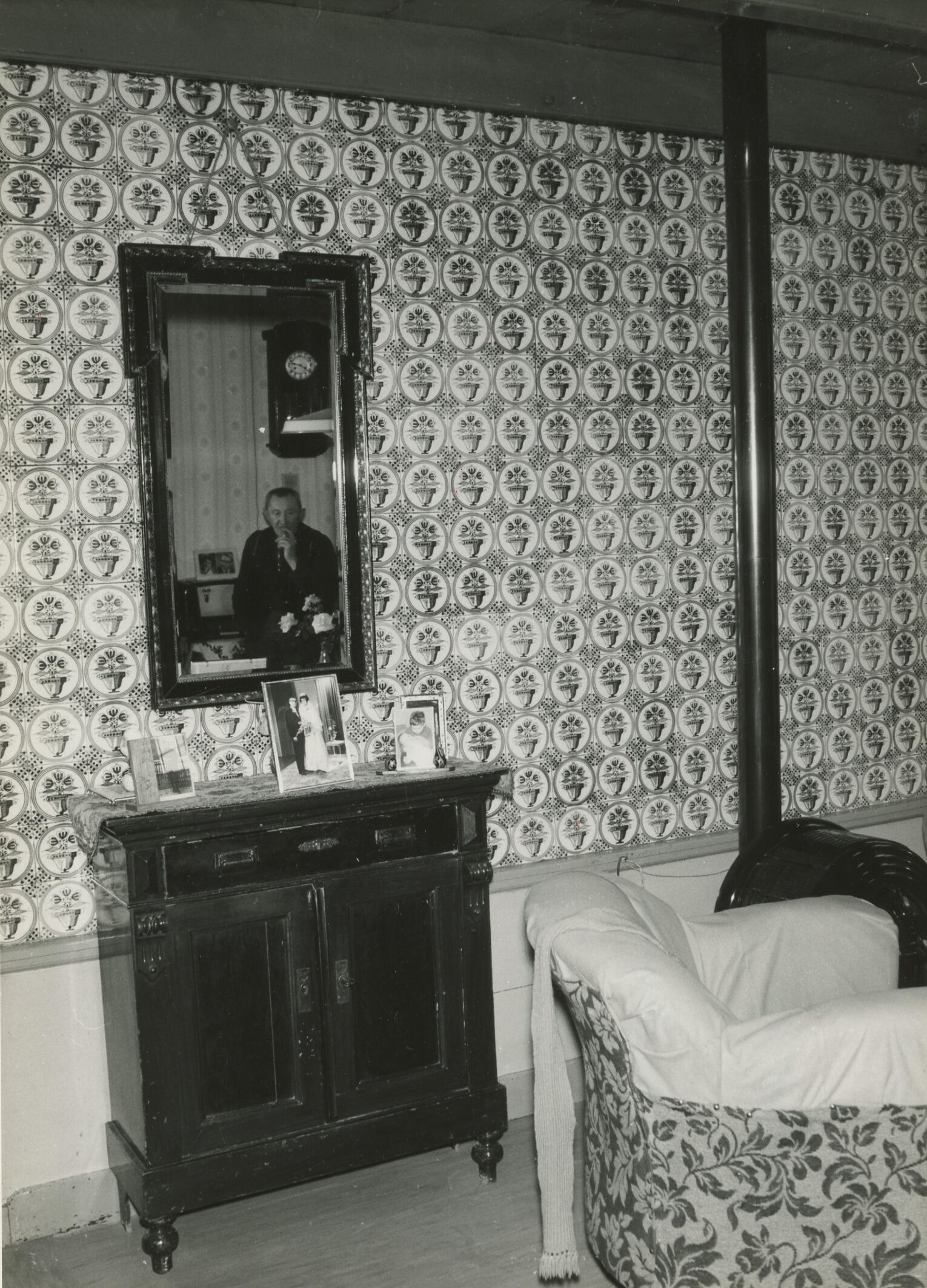 Interieur van een woning op Urk, bewoond door A. Romkes. De wand is voorzien van tegels met een bloempotmotief in mangaankleur.
