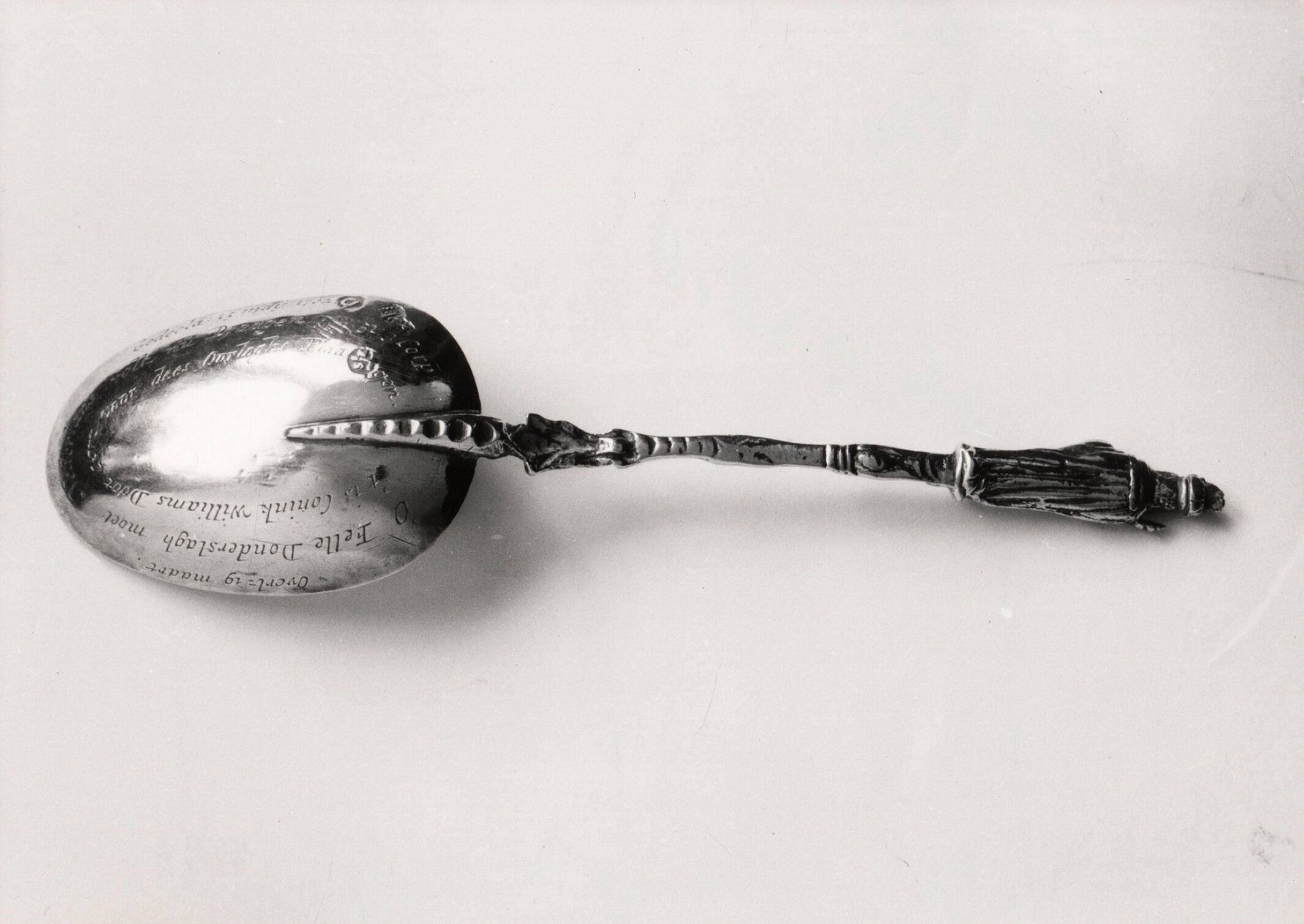 Een zilveren lepel, vervaardigd ter gelegenheid van het overlijden van koning-stadhouder Willem III in 1702. Het opschrift luidt: 'O Felle Donderslagh moet Nederlans volk nu Draagen W:51:3 Corp: 't is Coninck Williams Doot cort voor dees Oorloghs Plaagen. Overleden= 19 Maart, gedecla: 15 Maij 1702'. De lepel draagt het meesterteken IS met een hamer, toegeschreven ...