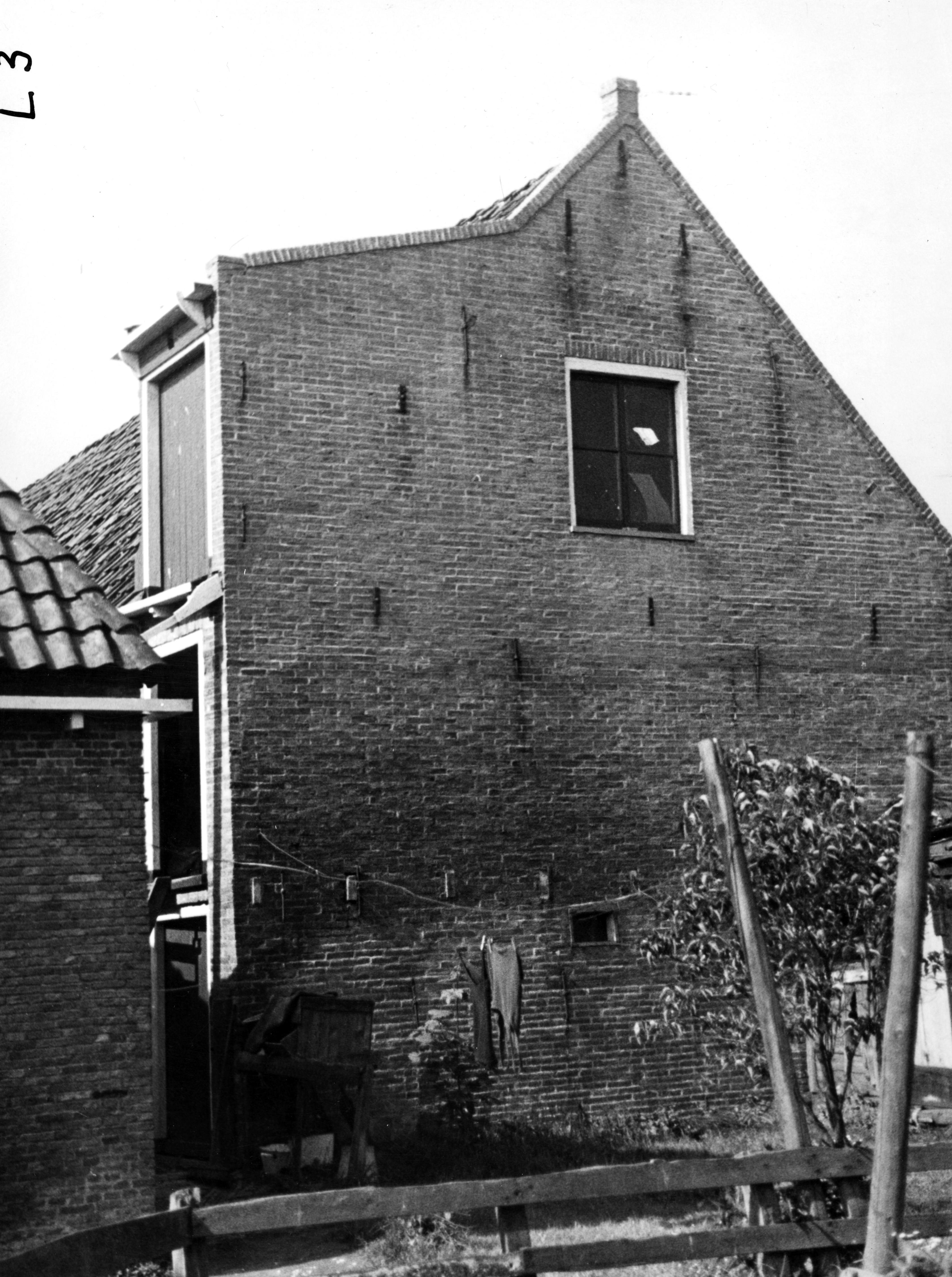 De achterzijde van het pand van NV Brandstoffenhandel 'De Goede Verwachting' aan het Turfland in Lemmer. Van circa 1892 tot 1928 was hier de pottenbakkerij 'De Goede Verwachting' gevestigd. Cornelis Steenstra en Fokke Hoekstra vervaardigden hier het zogenoemde Lemster kerfsnedeaardewerk.