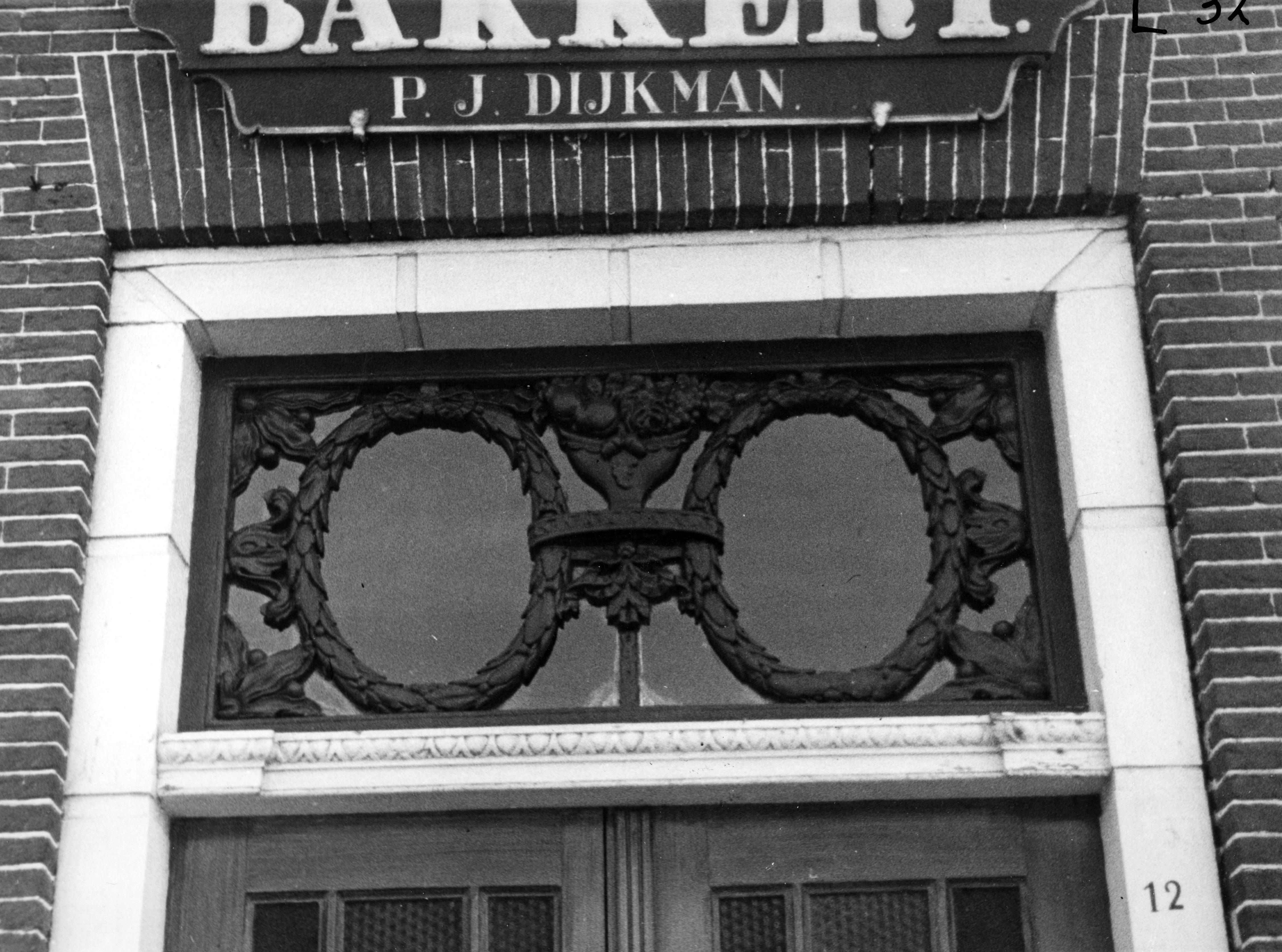 Een bewerkt bovenlicht van een pand aan de Langestreek 12 in Lemmer. Boven de deur hangt een bord met de tekst: 'Bakkerij P.J. Dijkman'.