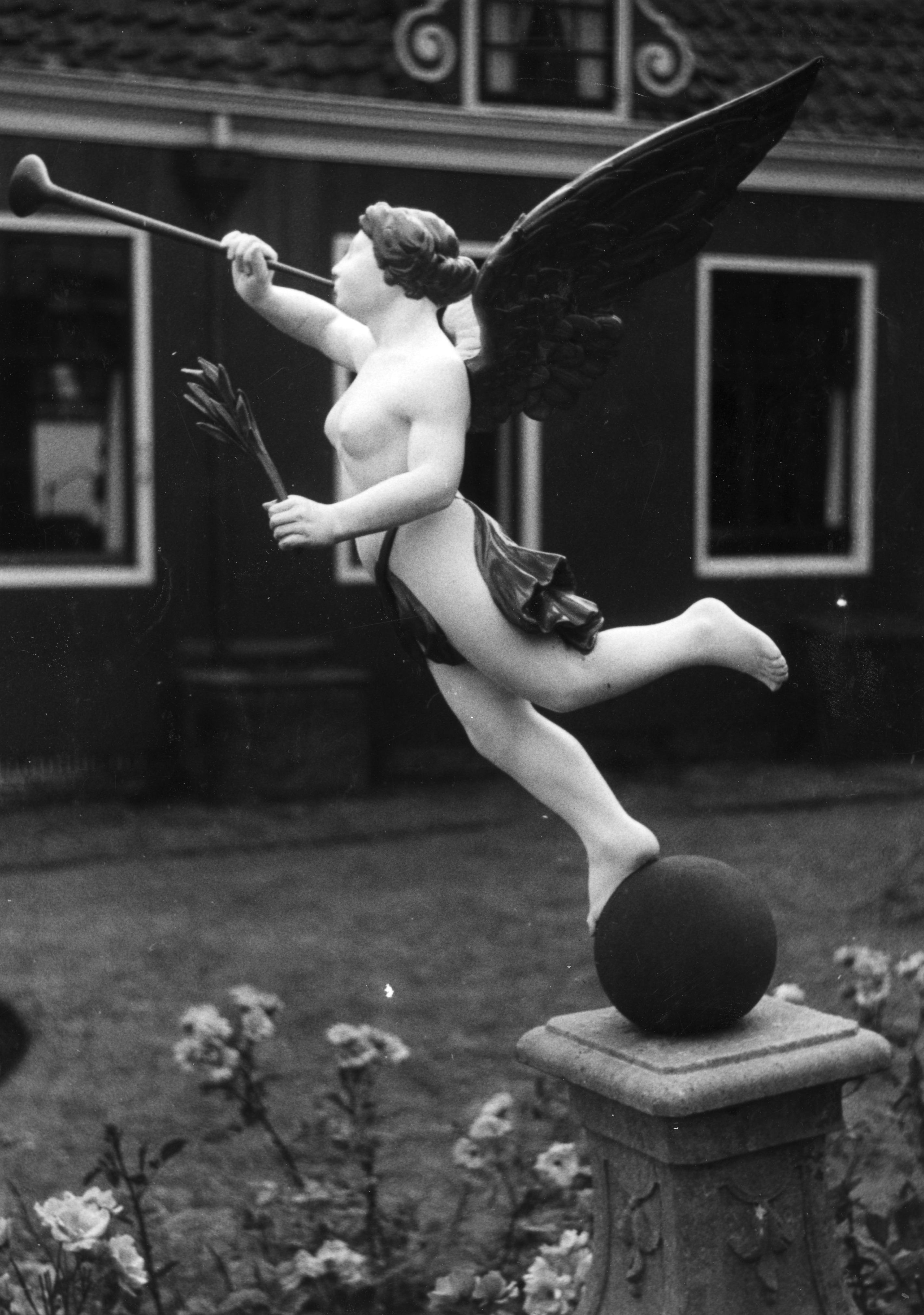 Een veelkleurig beschilderd tuinbeeld, voorstellend de Faam, op een natuurstenen voetstuk. Het tuinbeeld staat in een tuin van een koopmanshuis in Zaandijk.