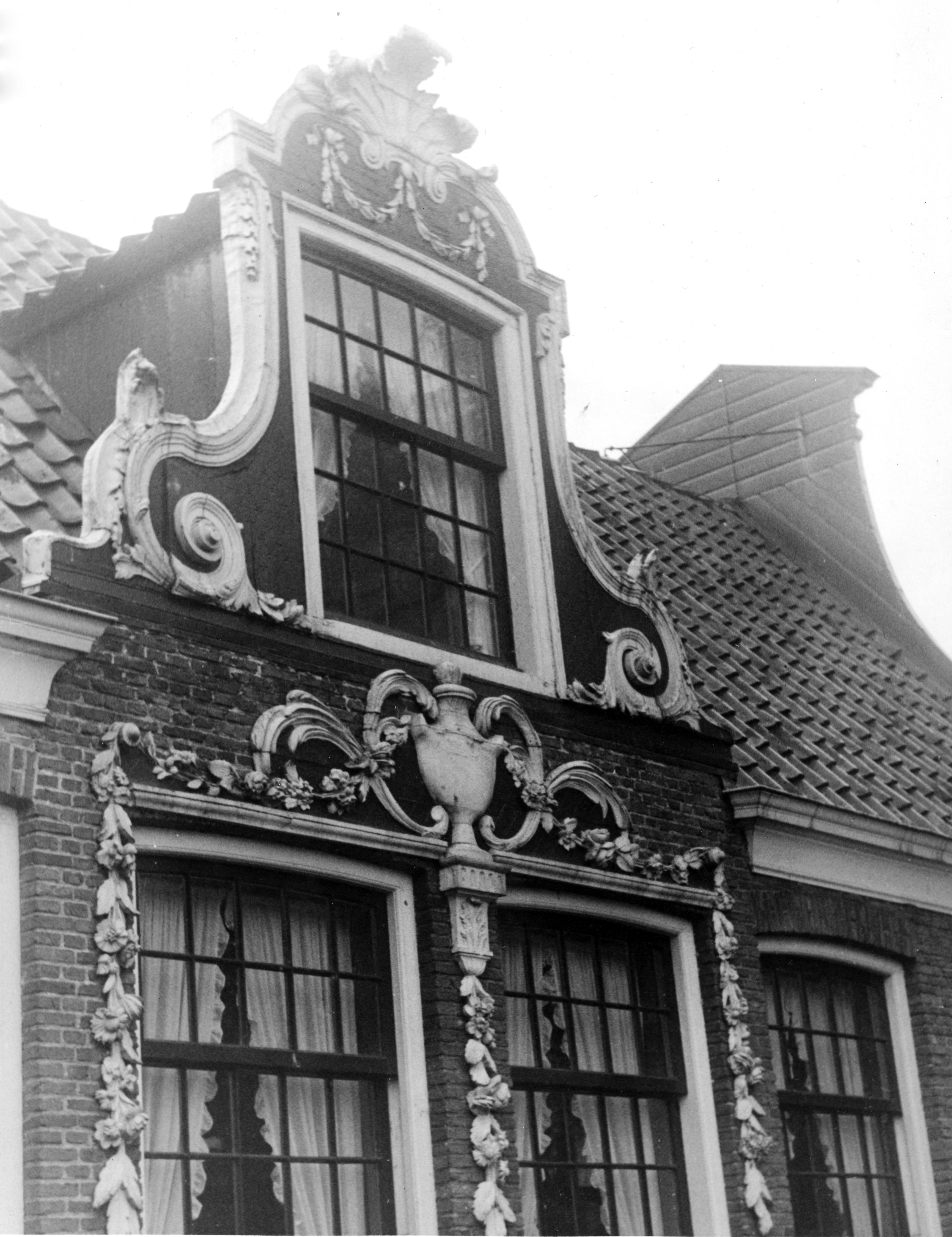 Versierde gevel van een koopmanshuis in Koog aan de Zaan. In dit pand, bekend als 'Huis met de ijzeren brug', was vanaf 1928 het molenmuseum gevestigd.