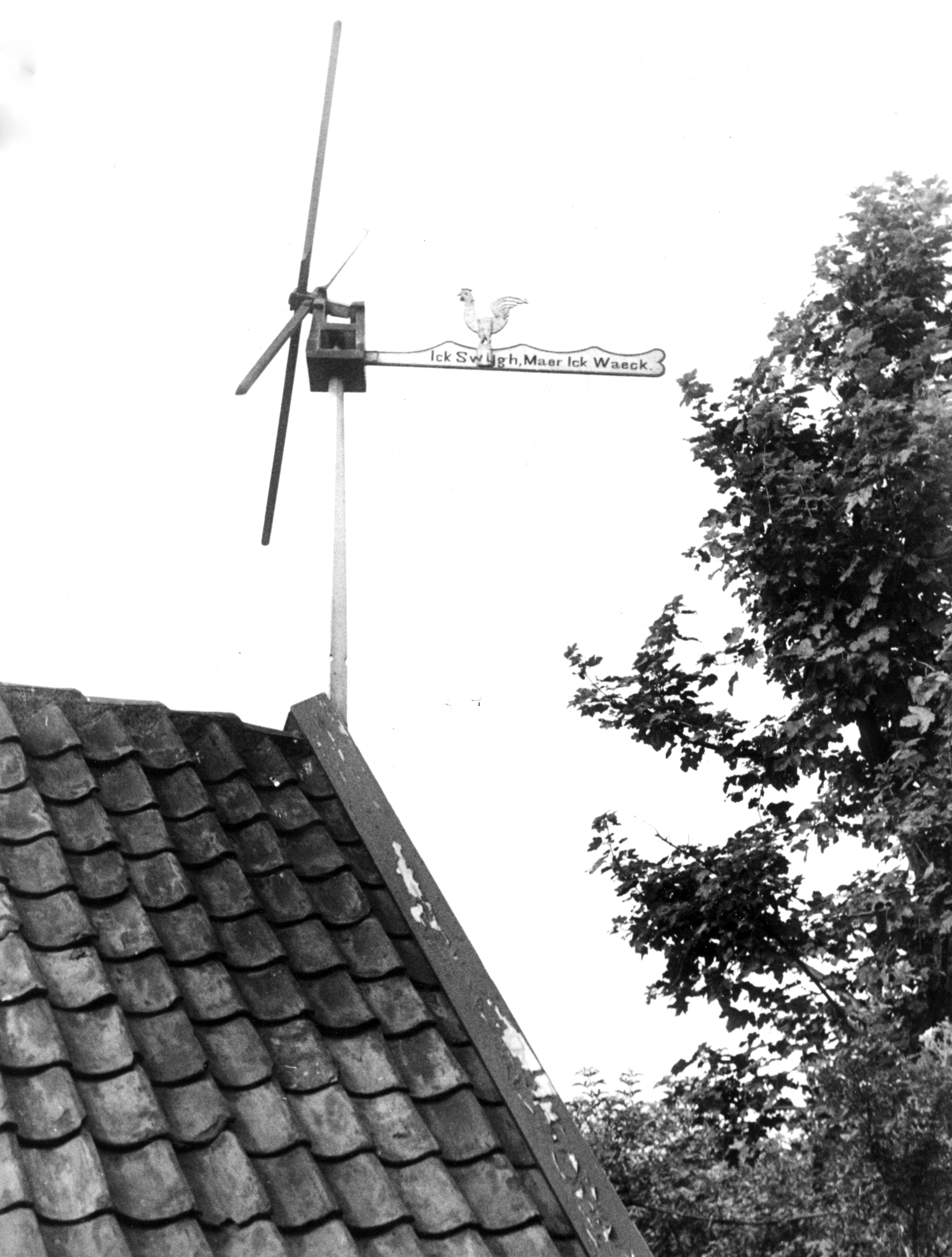 Windmolentje op het dak van het Molenmuseum in Koog aan de Zaan. Op de staart staat een haan, met eronder de tekst: 'Ick Swijgh, Maer Ick Waeck'.