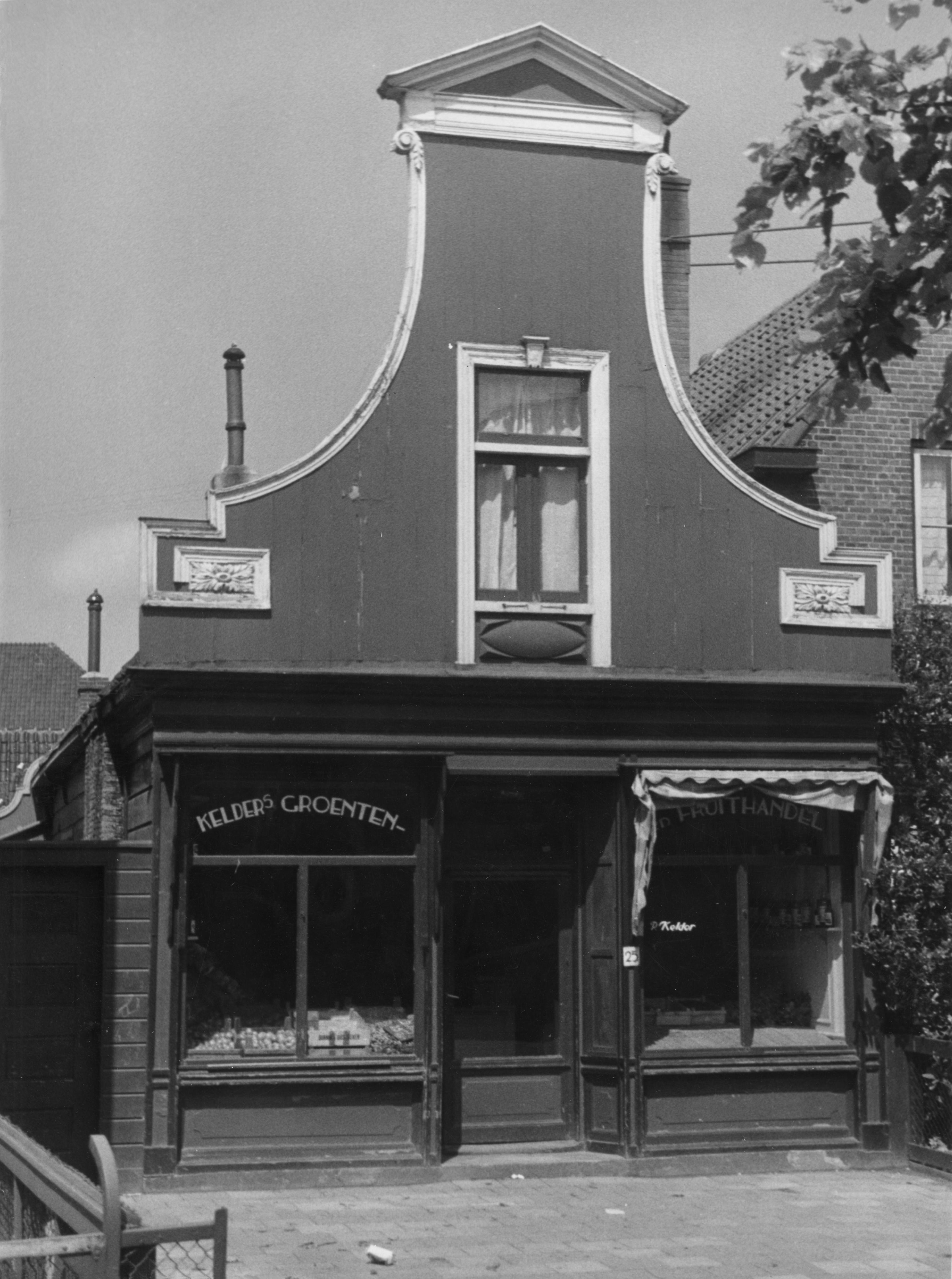 Middenstandswoning met groentewinkel aan de Lagedijk 25 in Zaandijk. Op de winkelruiten staat het opschrift: 'Kelders groenten- en fruithandel'. Het pand heeft een bewerkt houten klokgevel.