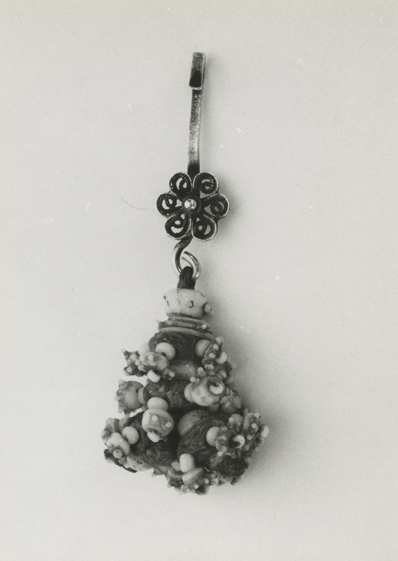Akertje van kralen aan een zilveren akerhaakje. Het akertje is vermoedelijk negentiende-eeuws en is afkomstig van Schokland. Het was in 1966 eigendom van een museummedewerker.