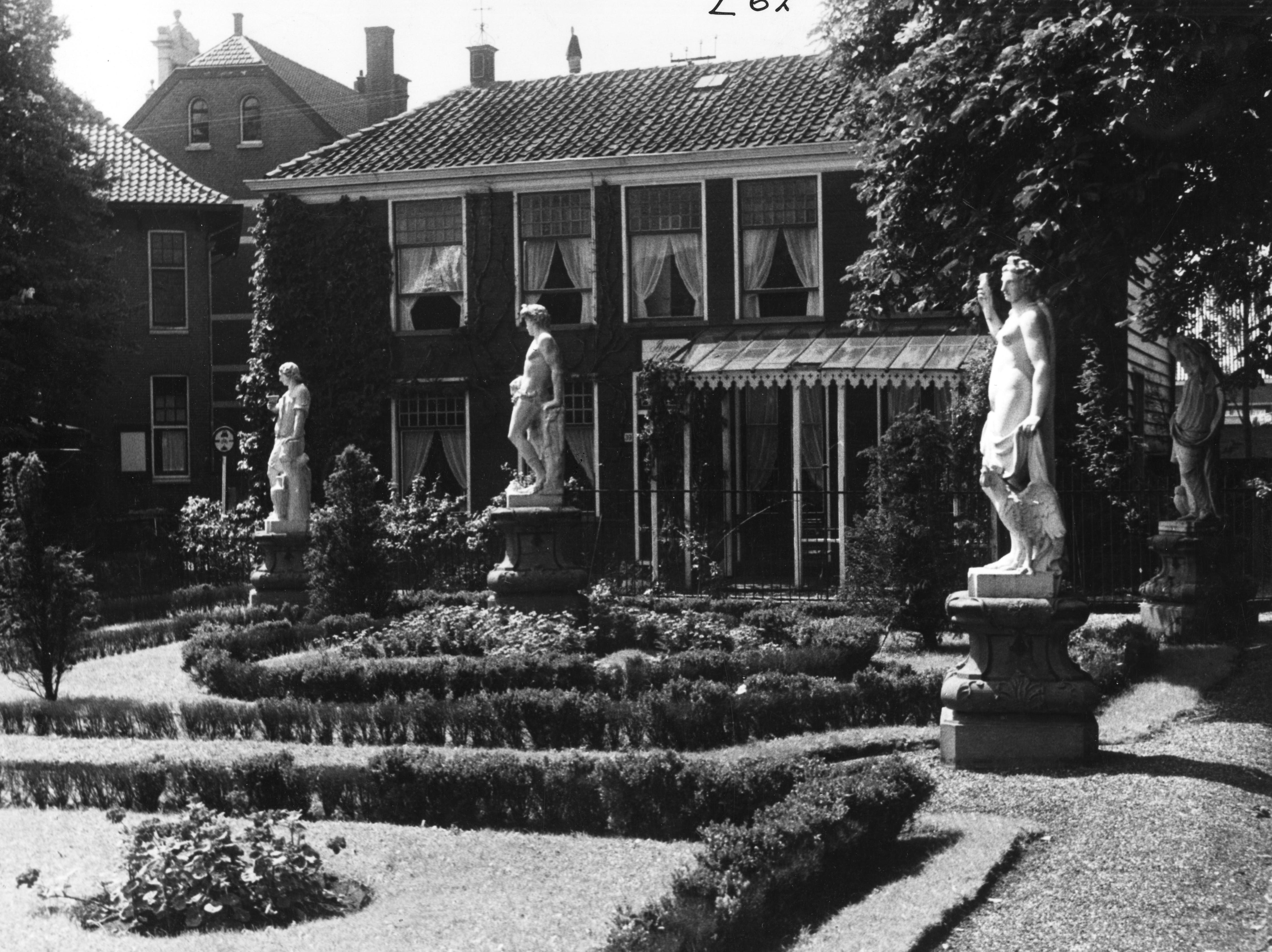 Zaanse tuin met tuinbeelden, 1942 (zwart-wit foto)