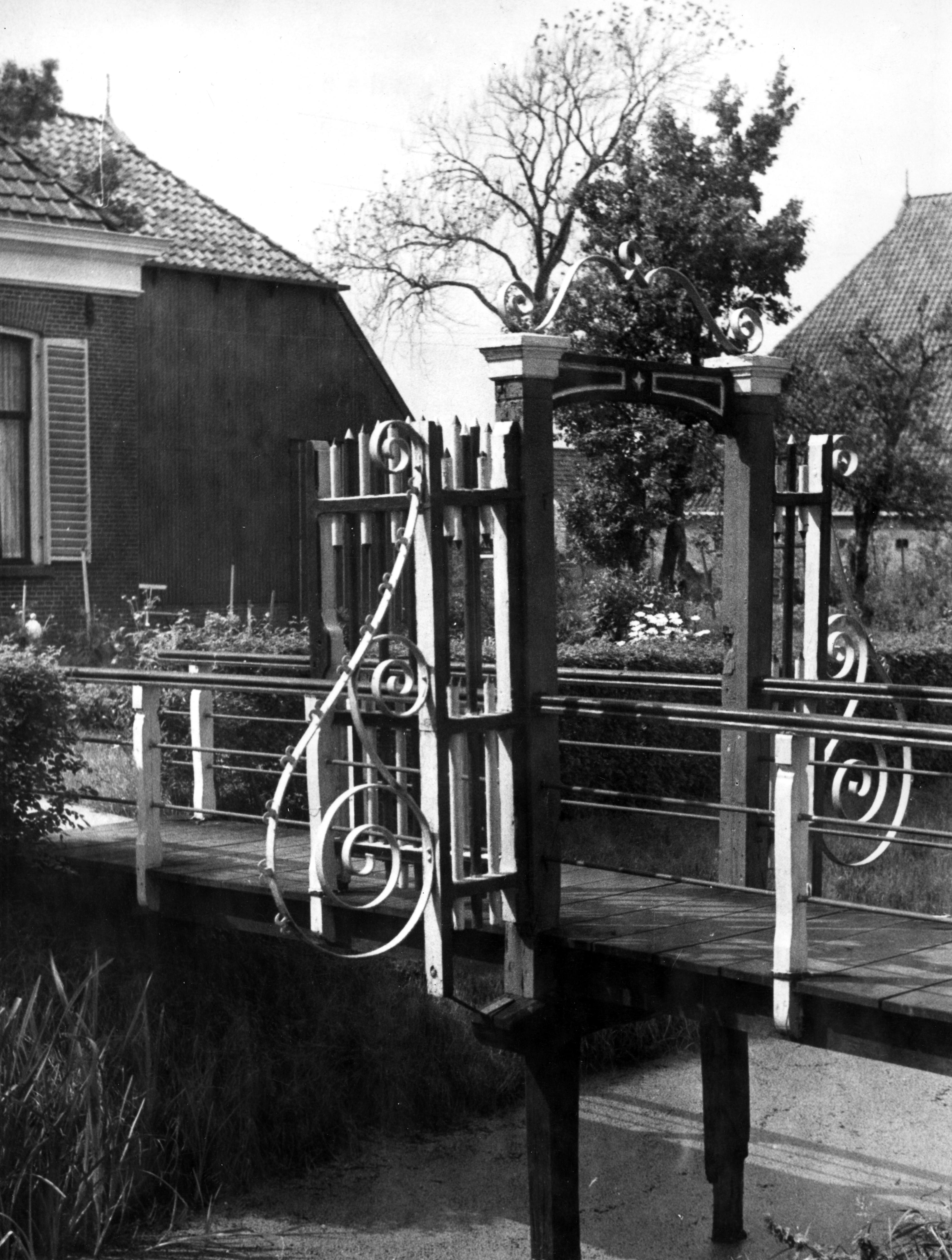 Brug met toegangspoort, Lippenwoude, 1942 (zwart-wit foto)