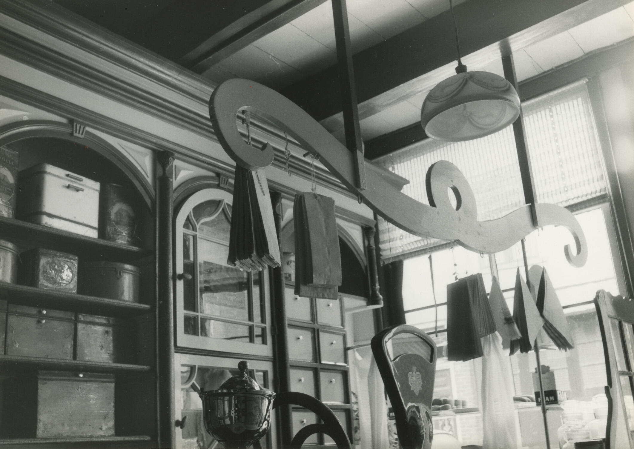 Het interieur van bakkerswinkel Van Doesburg aan de Kerkstraat 22 in Vollenhove. Boven de toonbank hangt een winkelslang. Op de toonbank staan een koffiemolen en een weegschaal. Bakker H.J. van Doesburg nam de bakkerij in 1912 over van Jan Voerman. De bakkerij en het winkelinterieur dateren uit het laatste kwart van de negentiende eeuw, evenals ...
