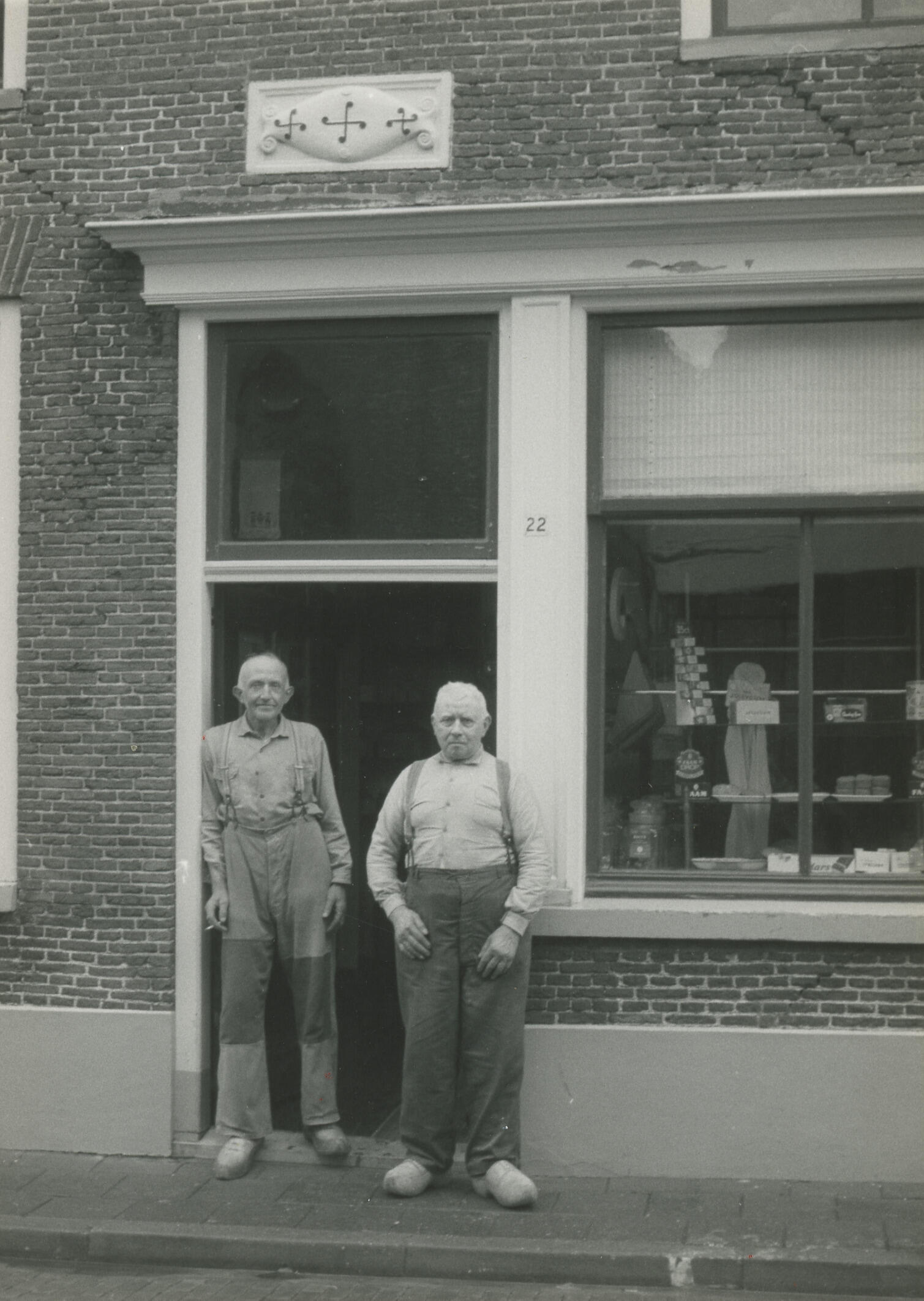 Twee bakkers voor bakkerij Van Doesburg aan de Kerkstraat 22 in Vollenhove. Bakker H.J. van Doesburg (rechts) is de eigenaar. De voorgevel van de bakkerij dateert uit het laatste kwart van de negentiende eeuw. In de voorgevel zijn drie oudere gevelstenen hergebruikt. Op de gevelsteen boven de deur staat een zogenoemde duivekater, met daarop drie ...