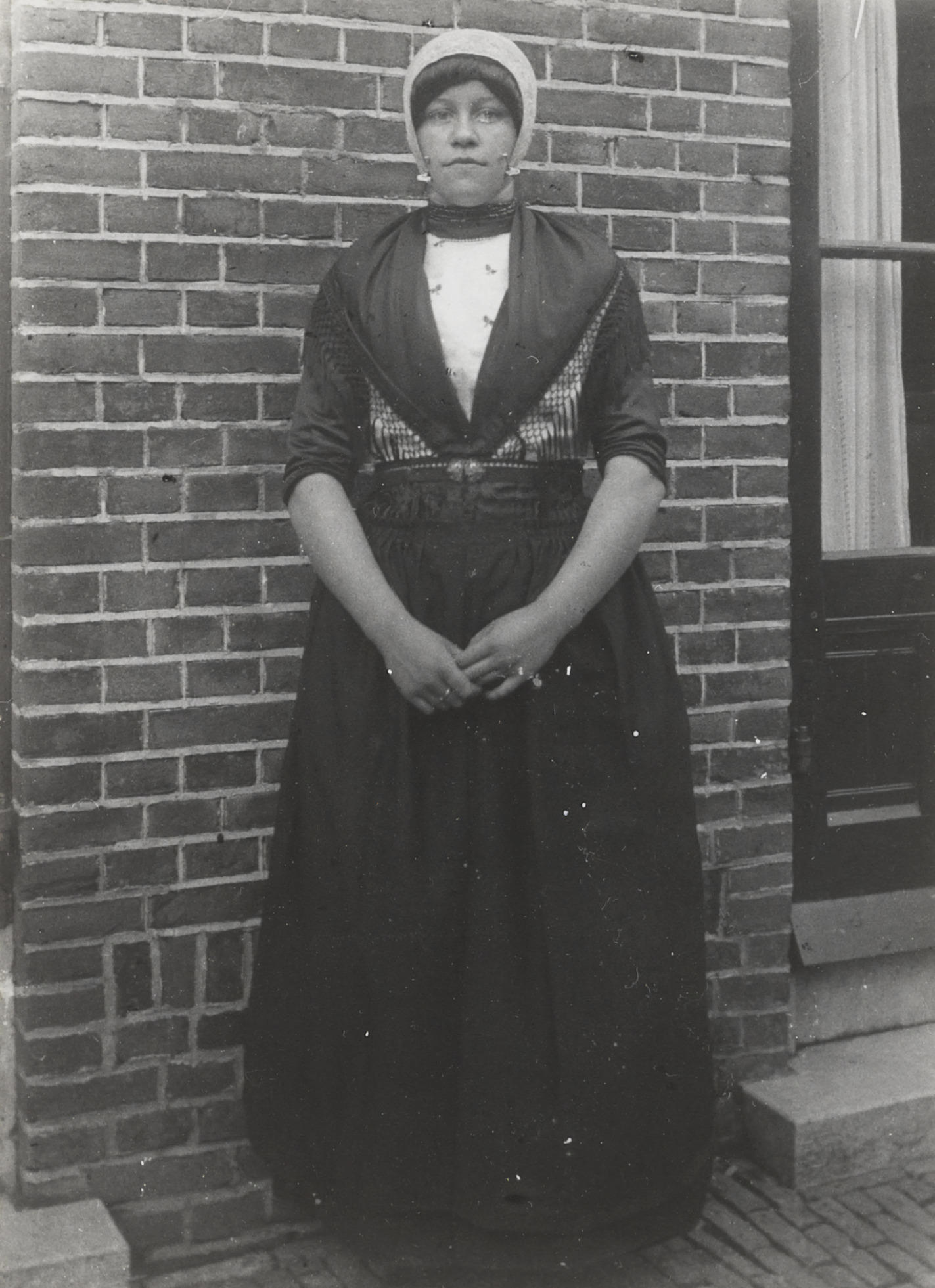 Geertje Brouwer in Urker dracht, circa 1916 (zwart-wit foto)
