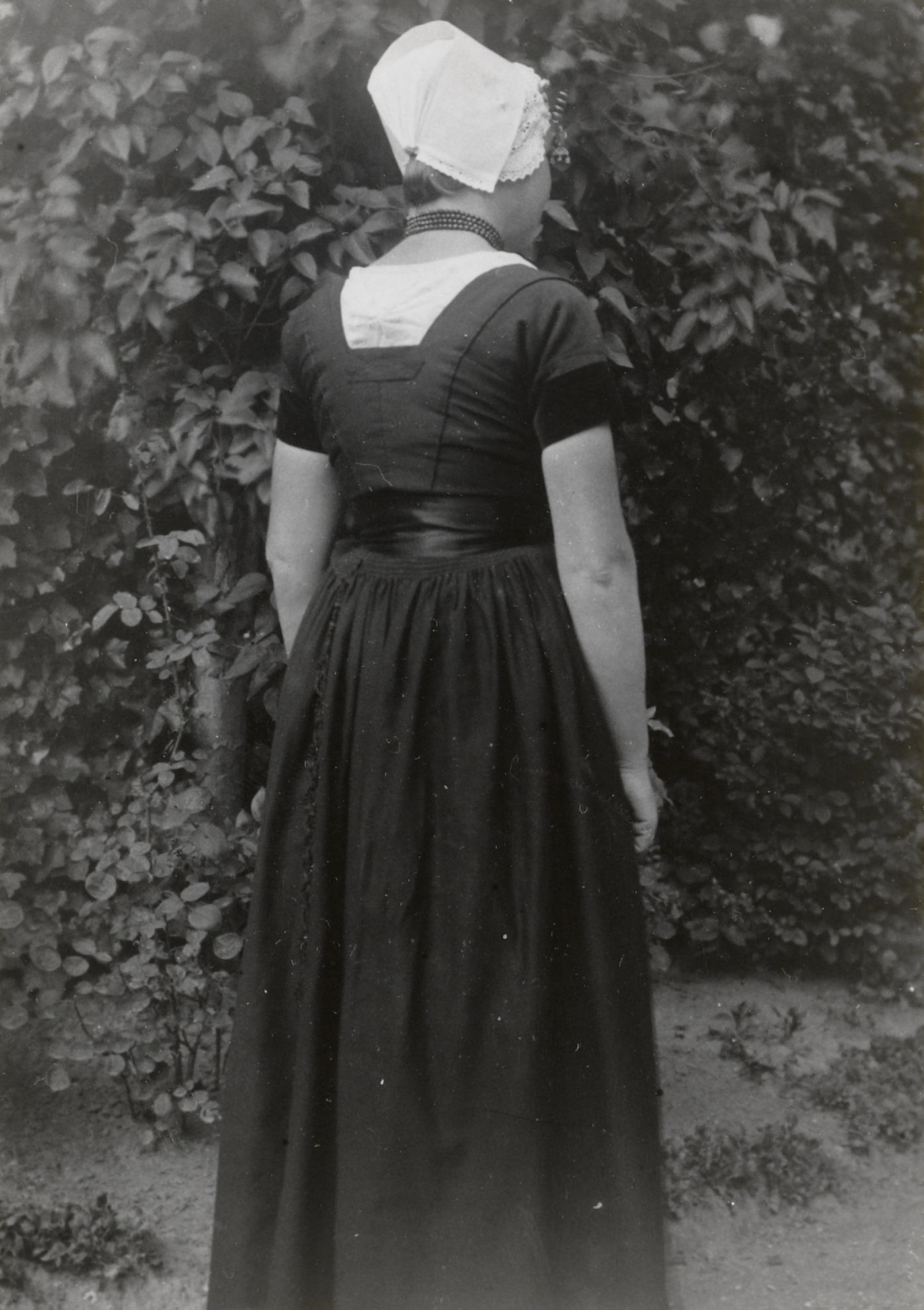 Achterzijde van een vrouw in Walcherse streekdracht.