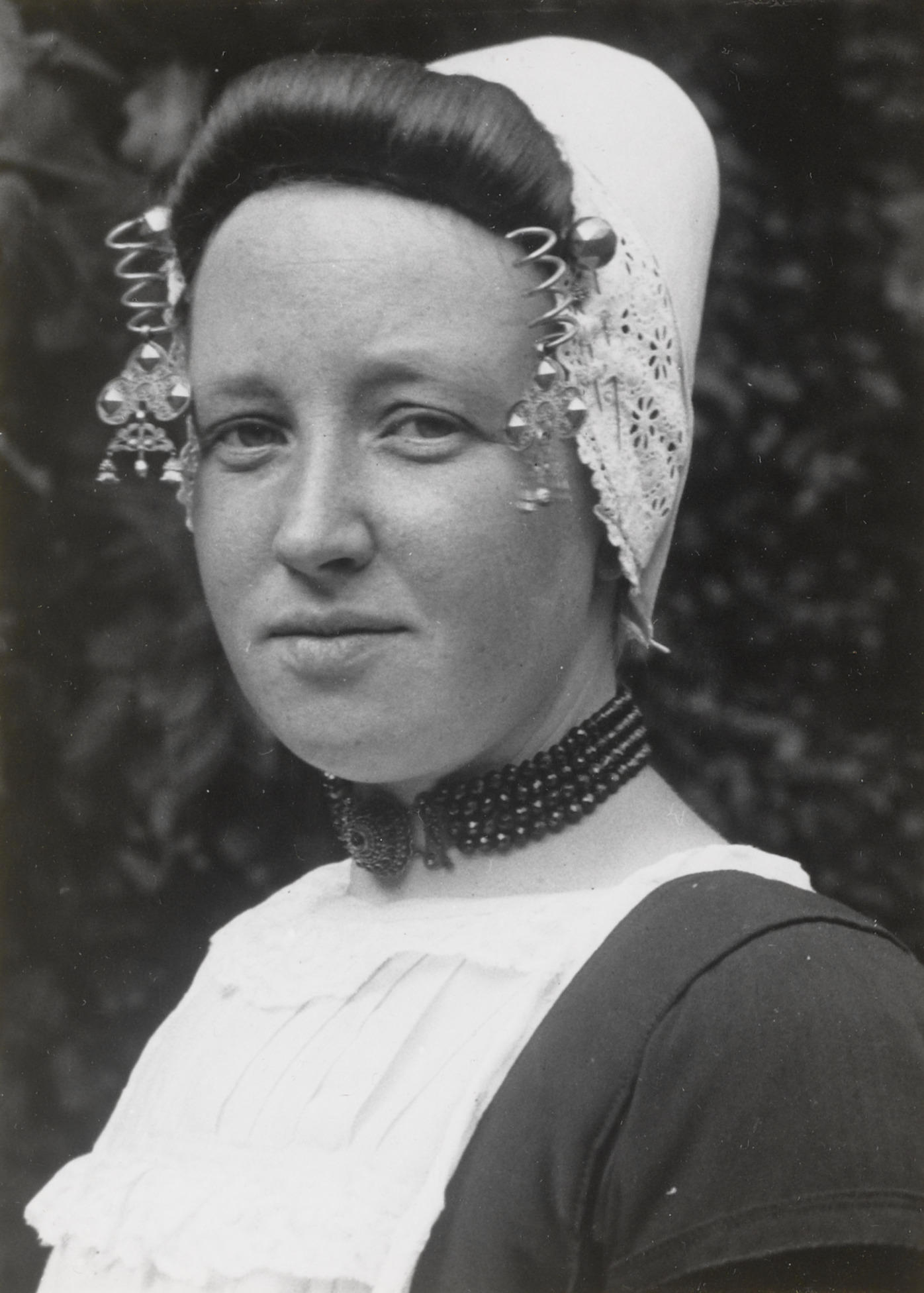 Vrouw in Walcherse dracht, 1913–1916 (zwart-wit foto)