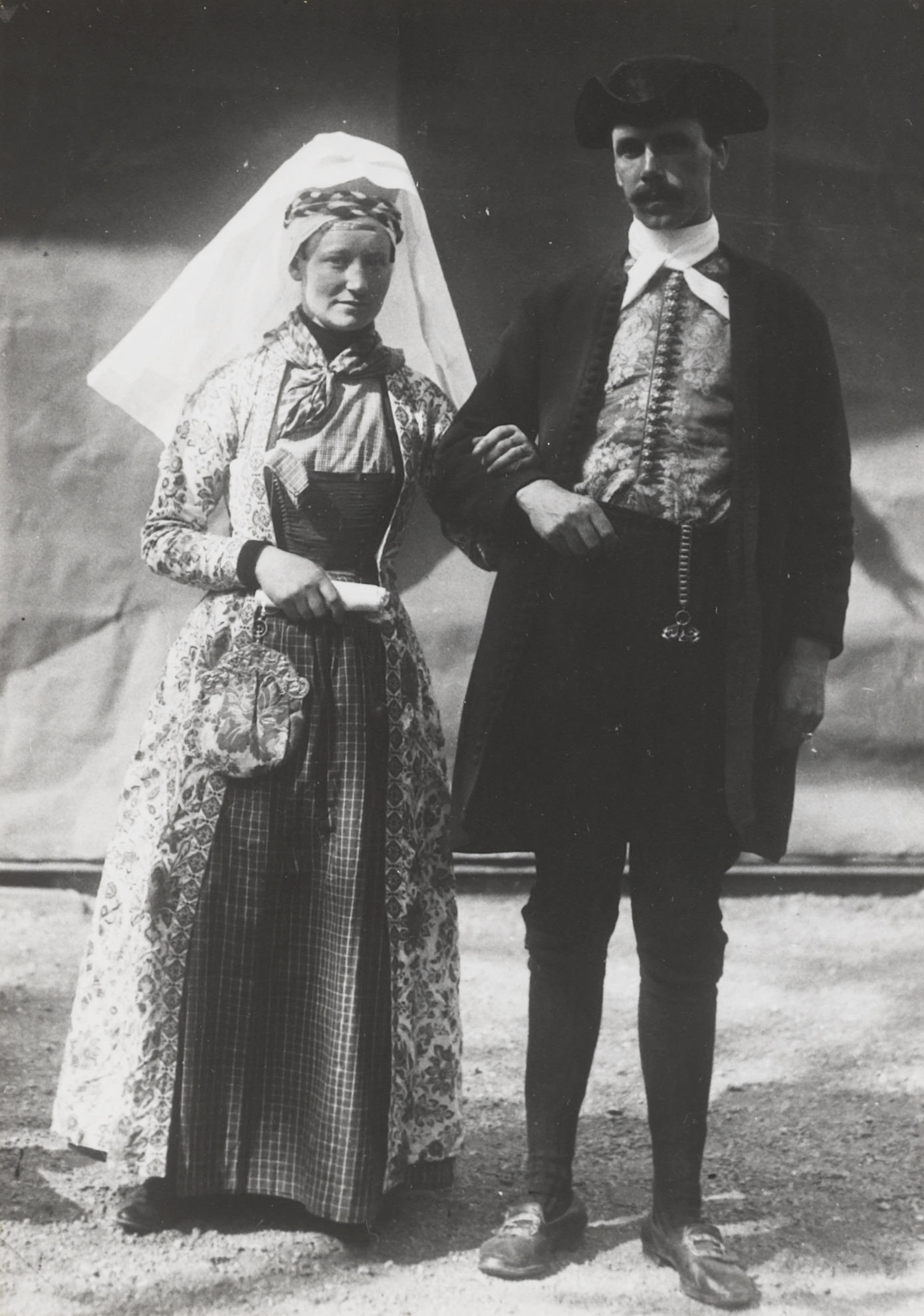 Vrouw en man, verkleed in Hindelooper streekdracht. De vrouw draagt het bruidskostuum. De foto is in 1913 gemaakt in Amsterdam tijdens het Klederdrachtenfeest. Dit feest was onderdeel van de festiviteiten rond de 100-jarige onafhankelijkheid van Nederland (1813-1913).