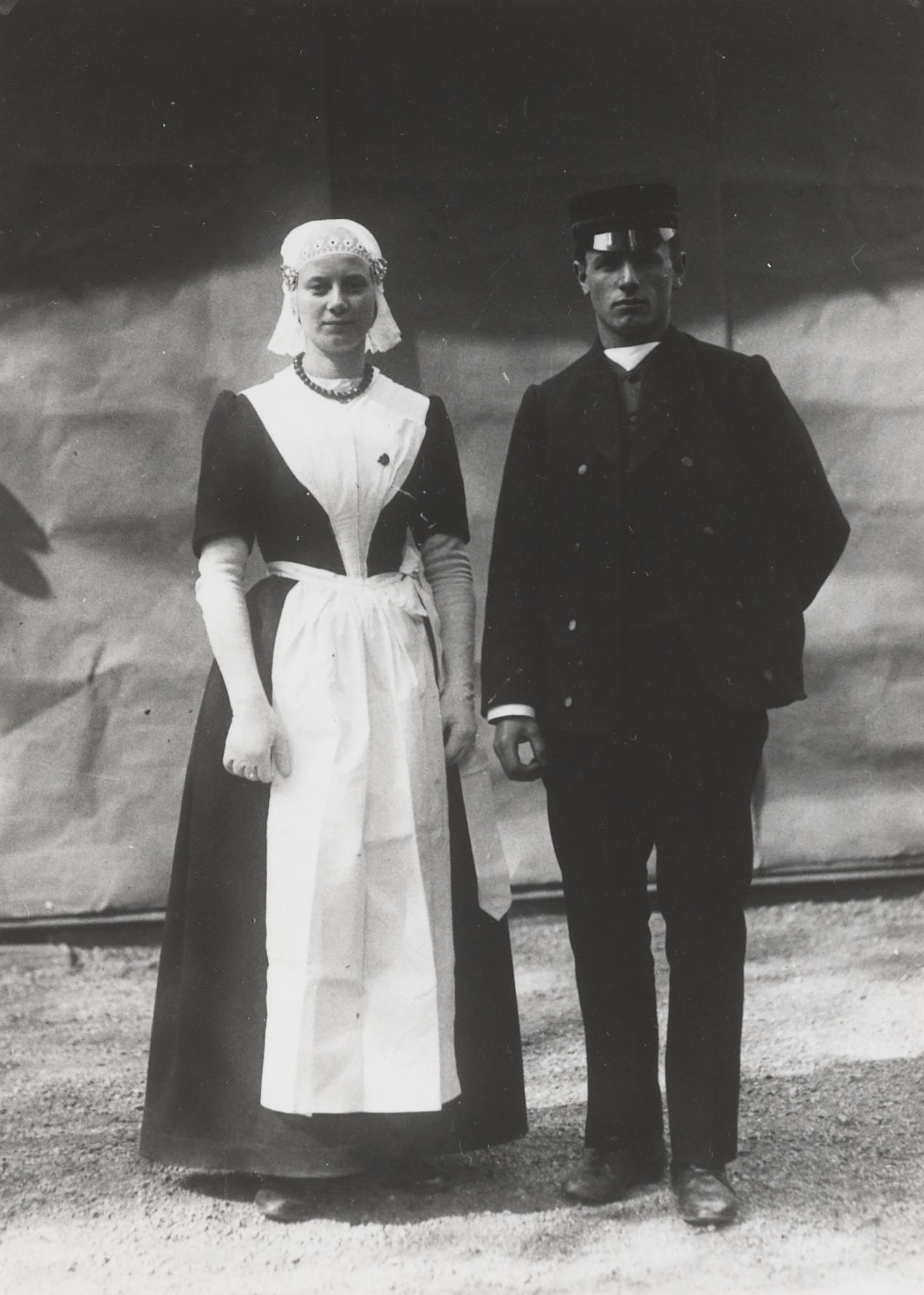 Meisje en jongen in weeskleding. Deze weeskleding werd gedragen in het Burgerweeshuis in Leeuwarden. De foto is in 1913 gemaakt in Amsterdam tijdens het Klederdrachtenfeest. Dit feest was onderdeel van de festiviteiten rond de 100-jarige onafhankelijkheid van Nederland (1813-1913).