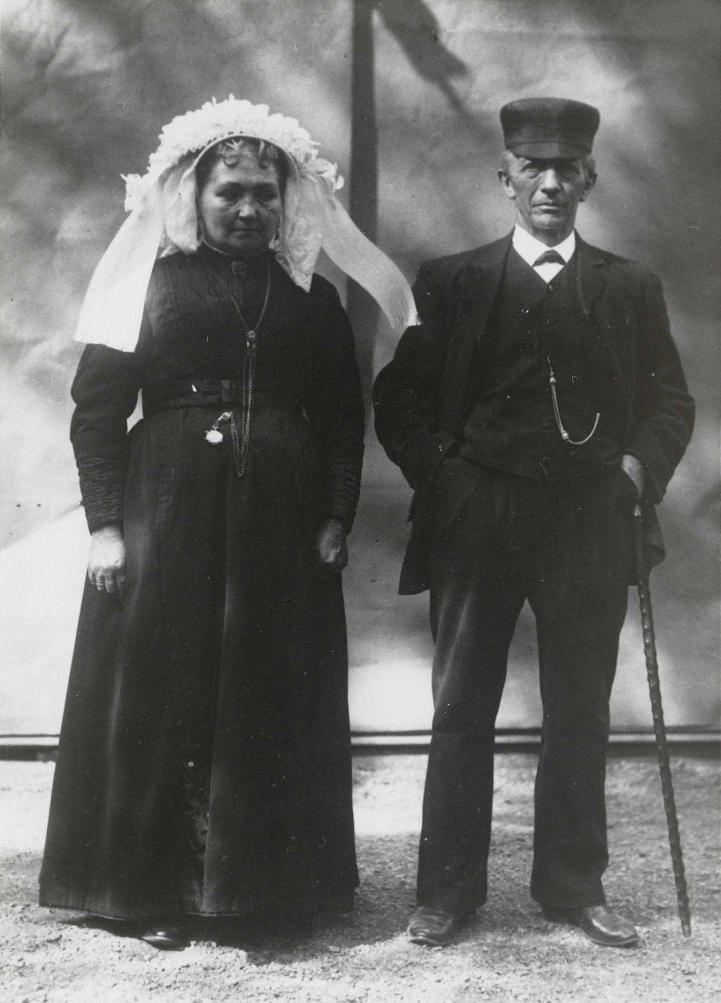 Katholieke vrouw en man uit Winssen, gekleed in de streekdracht uit het Land van Maas en Waal. De foto is in 1913 gemaakt in Amsterdam tijdens het Klederdrachtenfeest. Dit feest was onderdeel van de festiviteiten rond de 100-jarige onafhankelijkheid van Nederland (1813-1913).