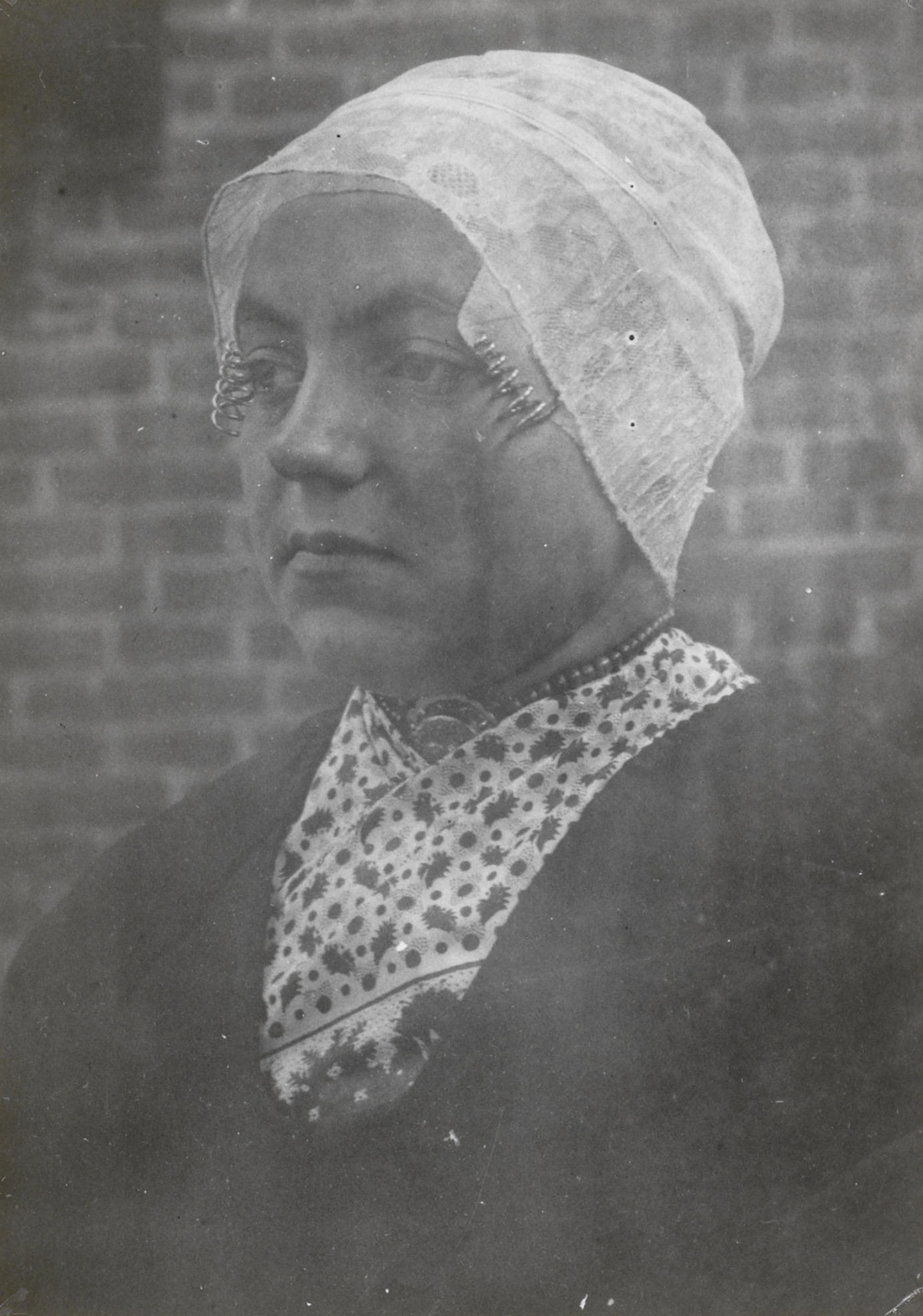 Vrouw uit Oldebroek, gekleed in streekdracht van de Noordwest-Veluwe. De vrouw draagt de kerkdracht.