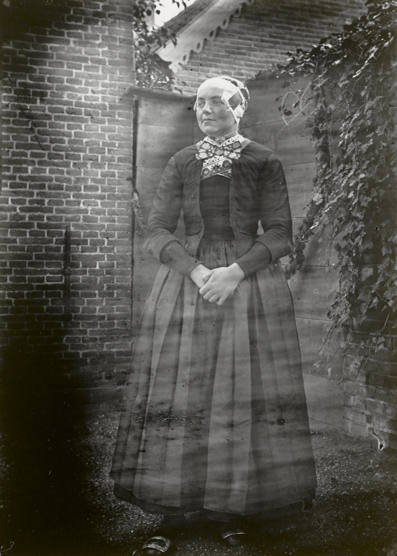 Vrouw uit Oldebroek in Veluwse streekdracht, circa 1915 (zwart-wit foto)