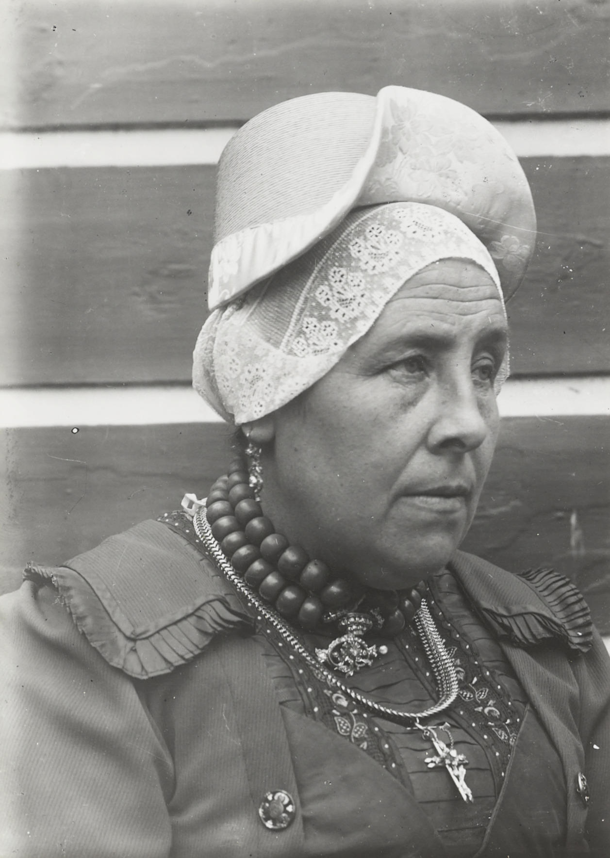 Vrouw in streekdracht uit West-Friesland, circa 1915 (zwart-wit foto)