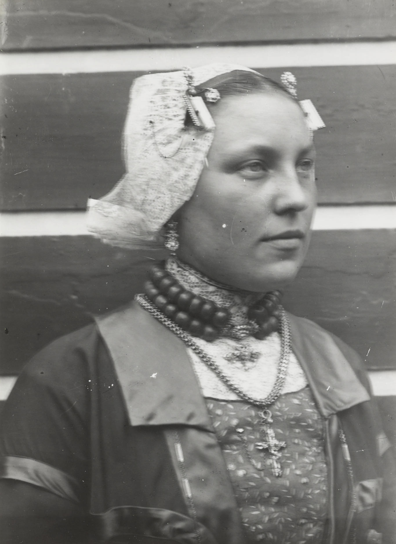 Vrouw in katholieke dracht van West-Friesland, circa 1915 (zwart-wit foto)