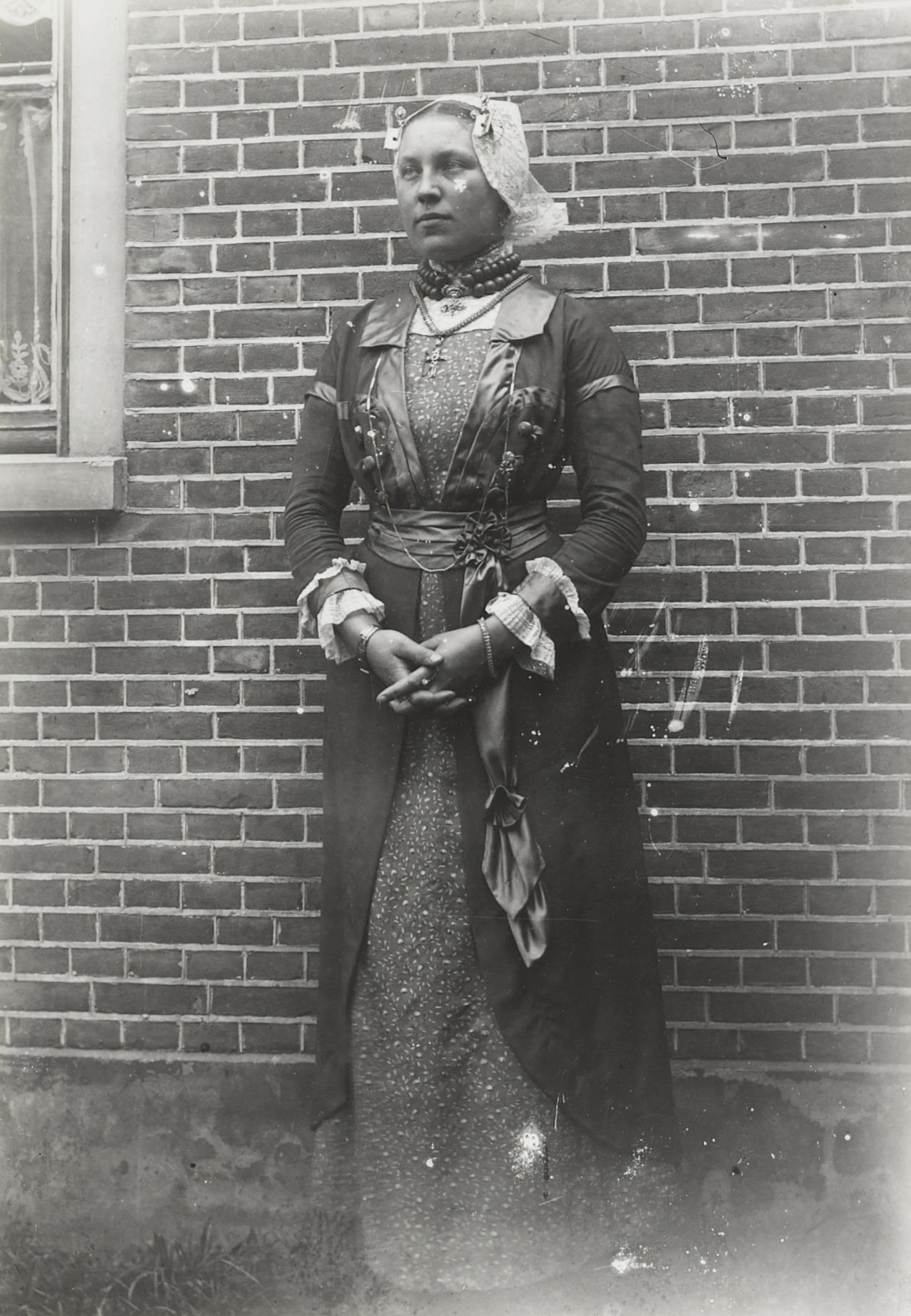 Vrouw in katholieke dracht van West-Friesland, circa 1915 (zwart-wit foto)