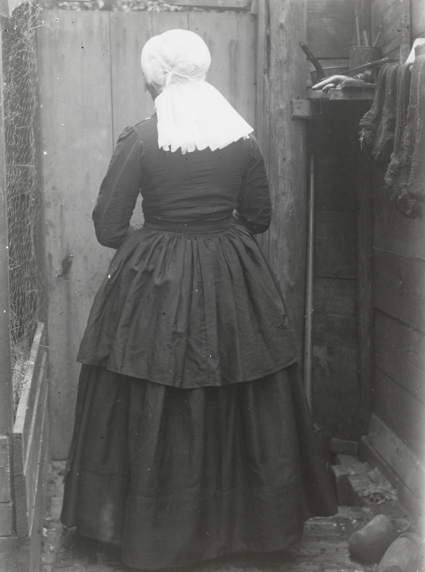 Achterzijde van een vrouw in streekdracht uit Kampen.