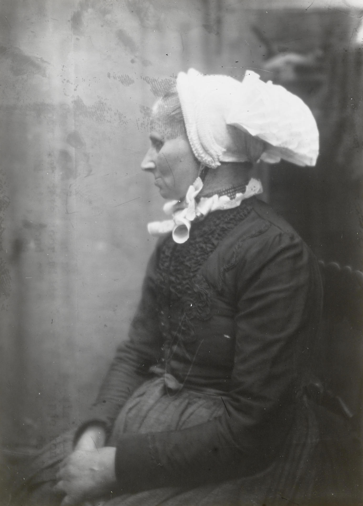 Vrouw in streekdracht uit Kampen. De vrouw is gekleed in opknapdracht. Ze draagt een 'plooimuts' en een 'knupdoekje'.