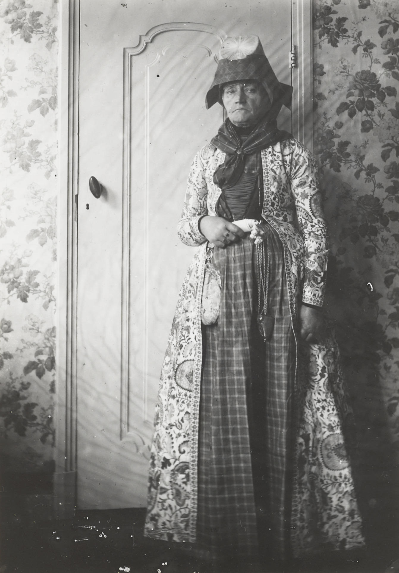 Vrouw in Hindelooper streekdracht, circa 1915 (zwart-wit foto)