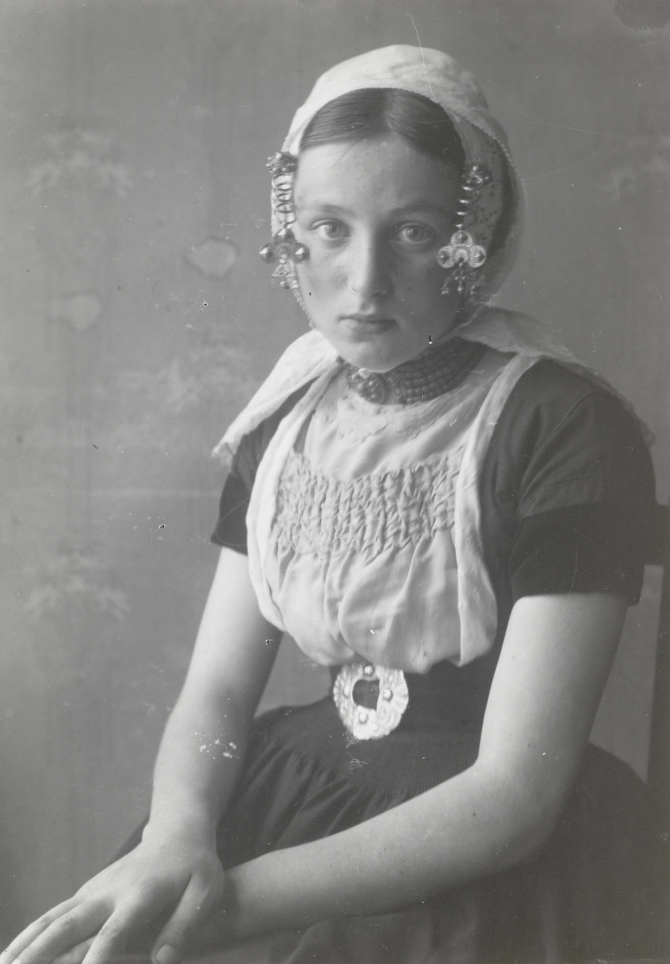 Meisje in Walcherse streekdracht. Het meisje is gekleed in kerkdracht. Een afgedankte zilveren schoengesp fungeert als ceintuurgesp. Aan de krullen van het oorijzer hangen oorijzerhangers, de zogenaamde 'strikken met waaiers'. Deze strikken werden gedragen in bepaalde dorpen langs de kust van Walcheren.