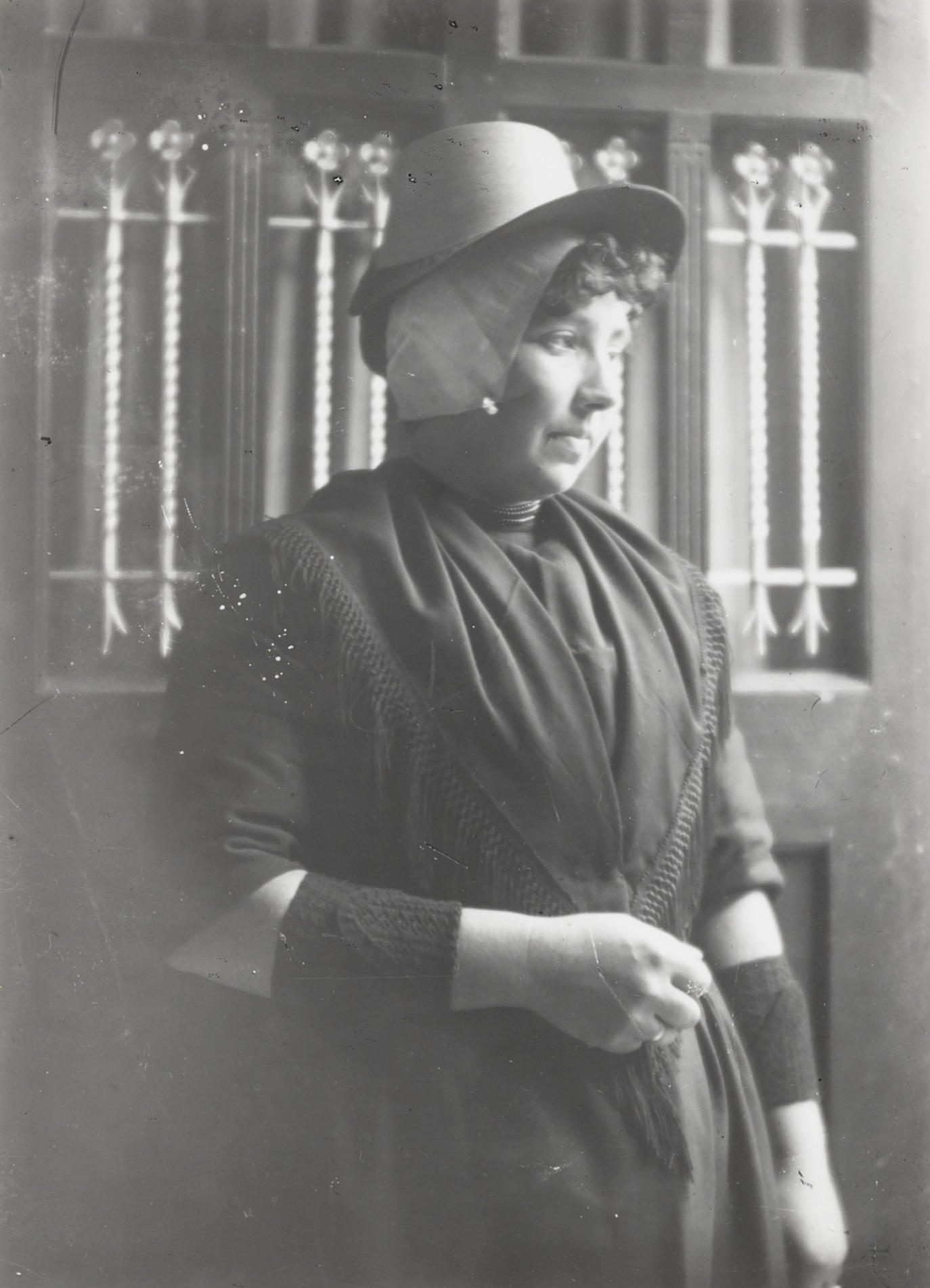 Vrouw in Urker streekdracht, circa 1916 (zwart-wit foto)