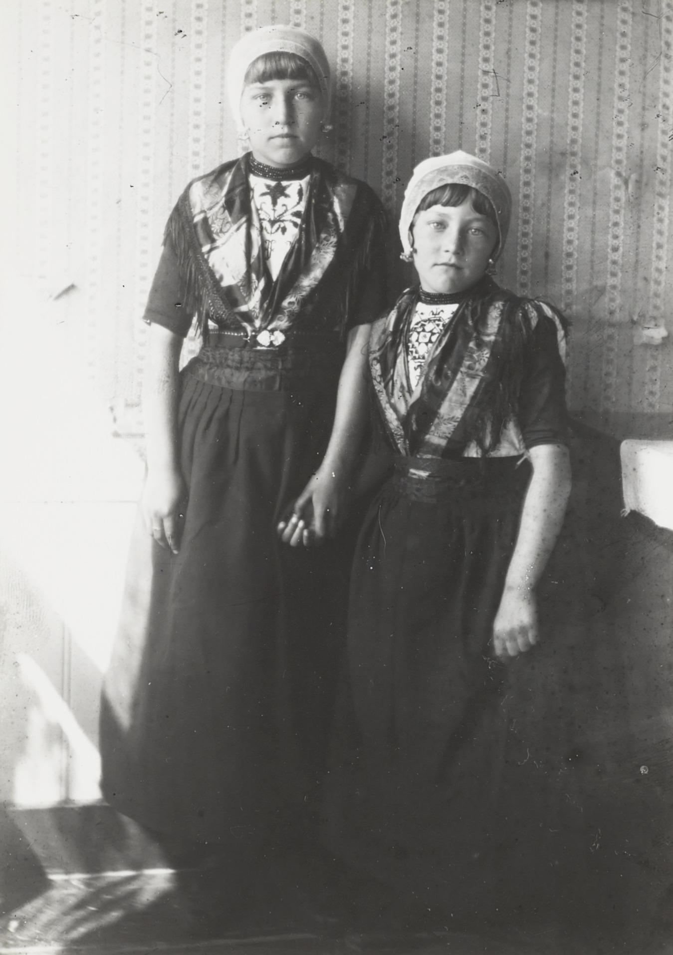Twee meisjes in Urker streekdracht, circa 1916 (zwart-wit foto)