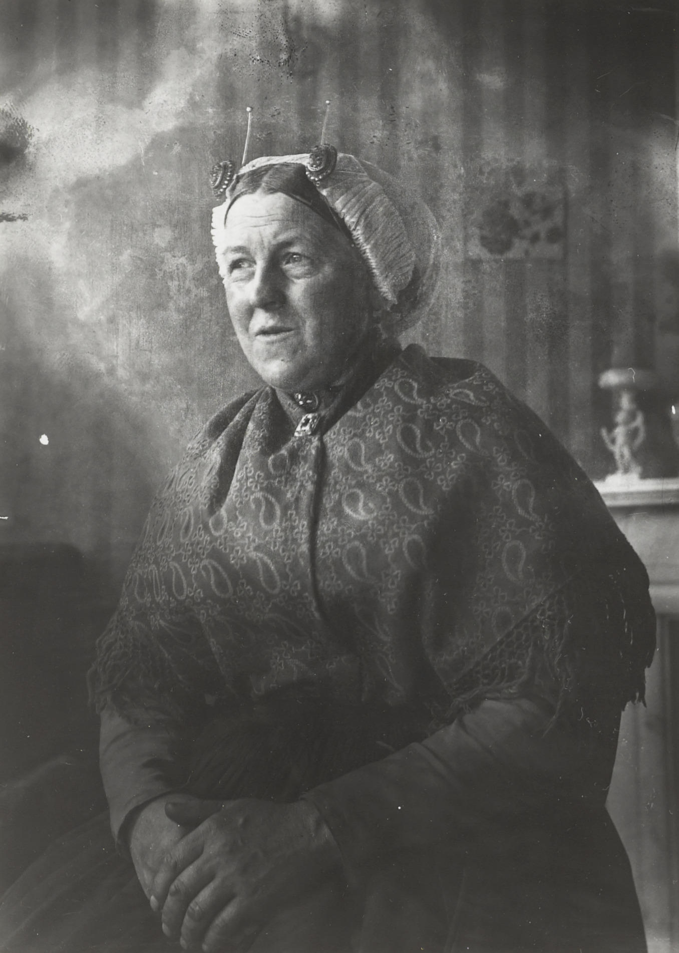 Vrouw in Scheveningse streekdracht, 1913–1916 (zwart-wit foto)