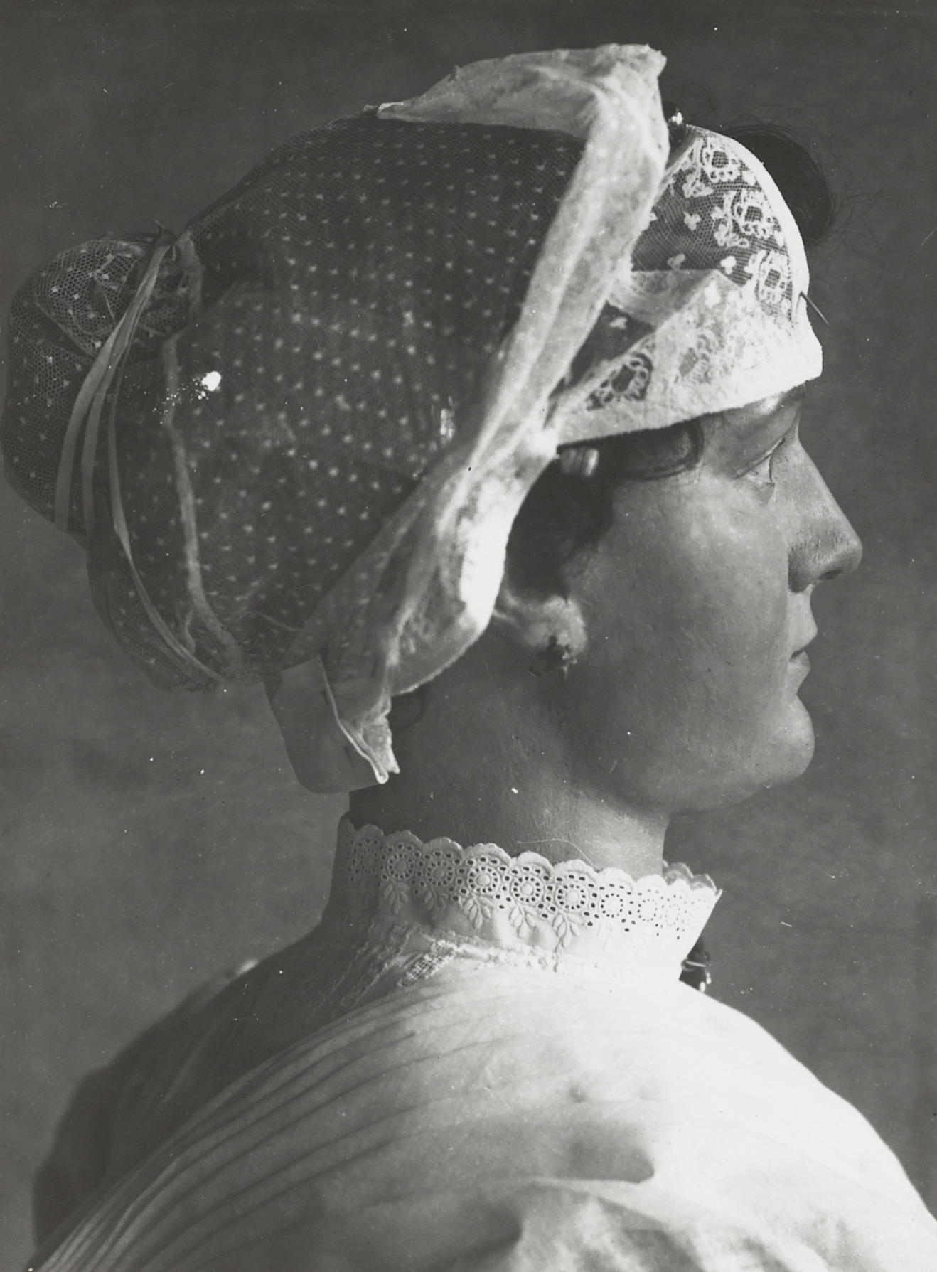 Pop in weeskleding van het Burgerweeshuis in Amsterdam, 1898–1916 (zwart-wit foto)