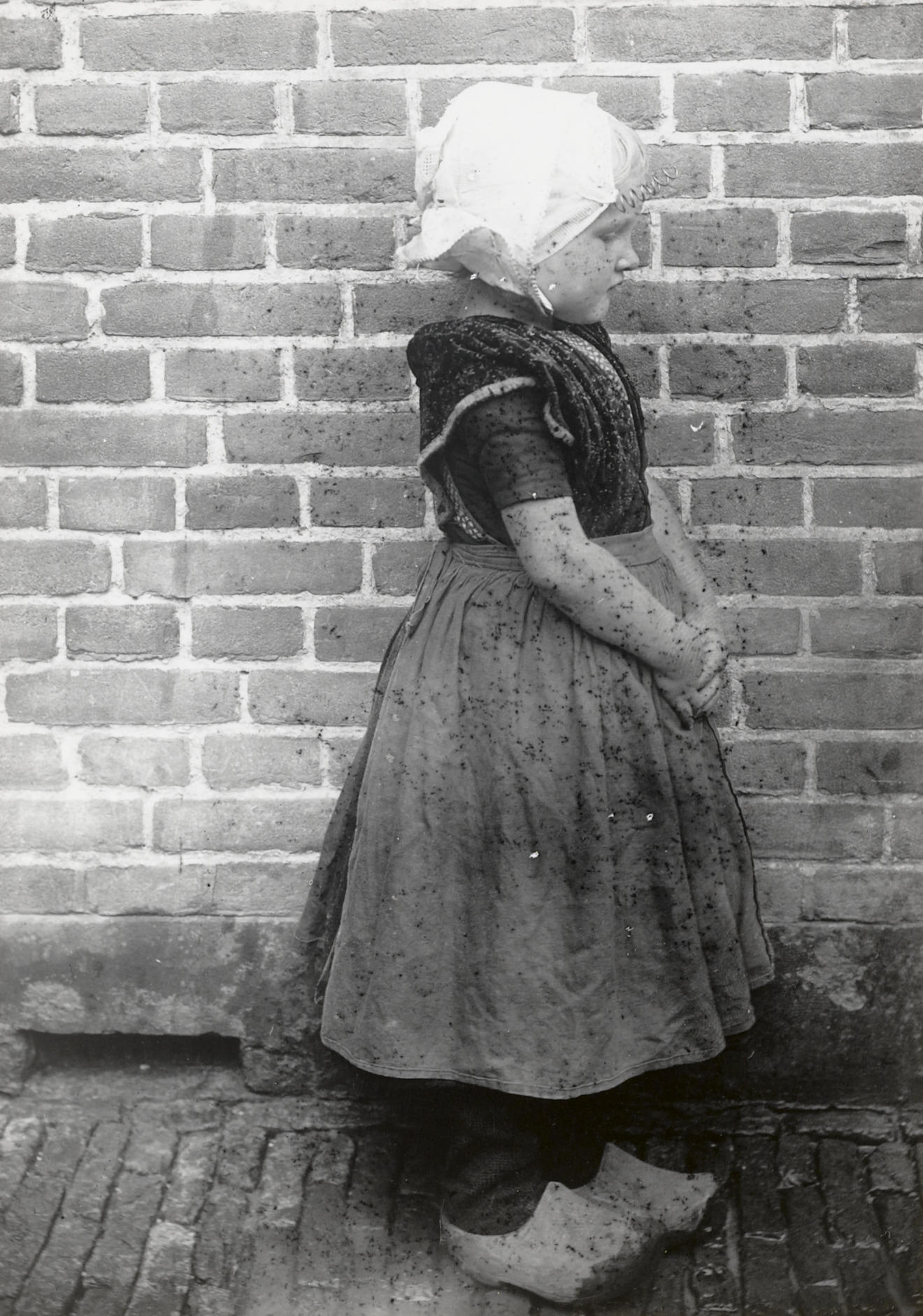 Zijaanzicht van een meisje in Arnemuider streekdracht.