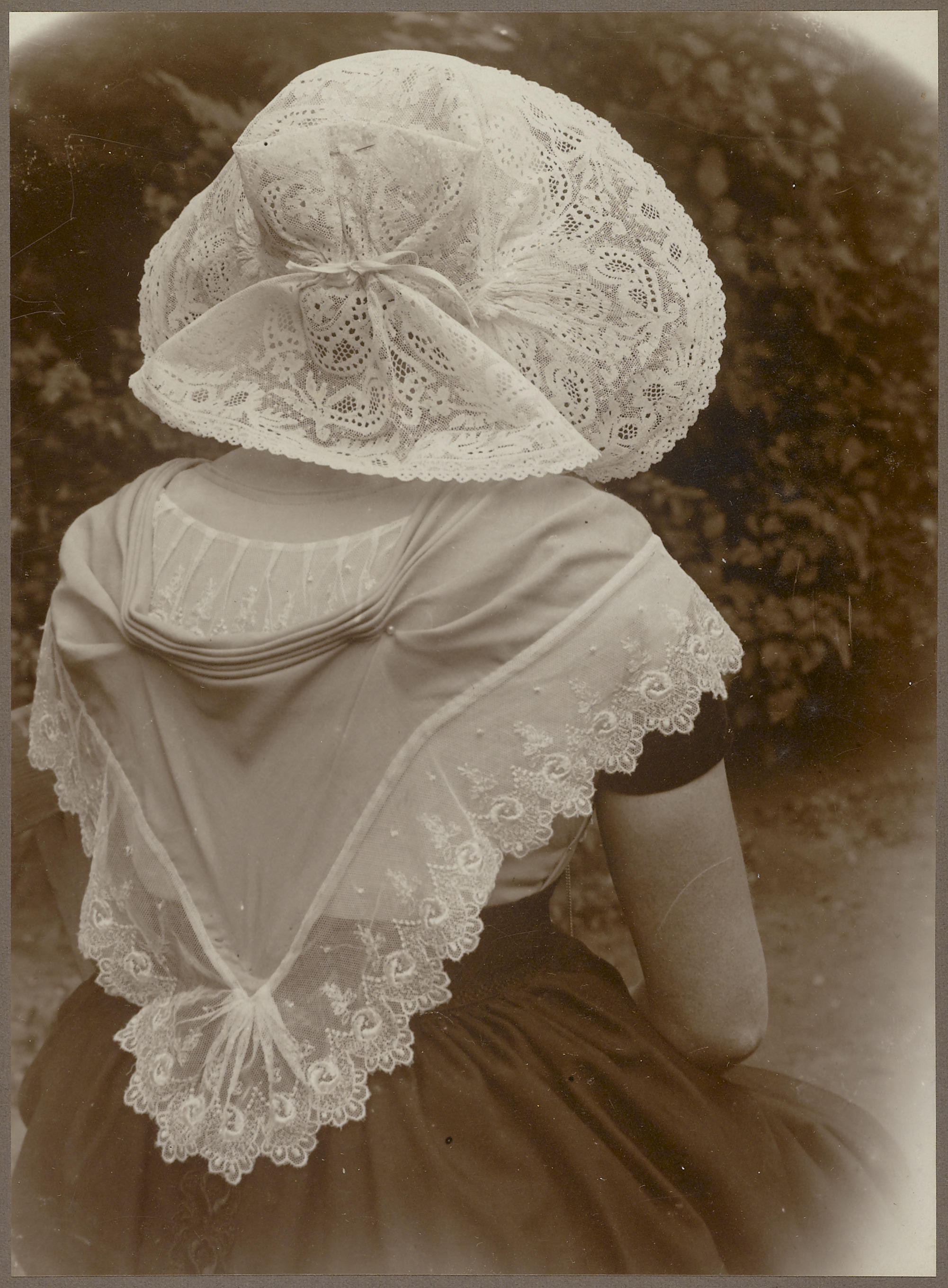 Vrouw in streekdracht uit Nieuw- of Sint-Joosland. Op haar hoofd draagt ze een muts van kloskant, van het kornettype. De halslijn van de beuk (de kroplap) en de randen van de schouderdoek zijn afgewerkt met kant.