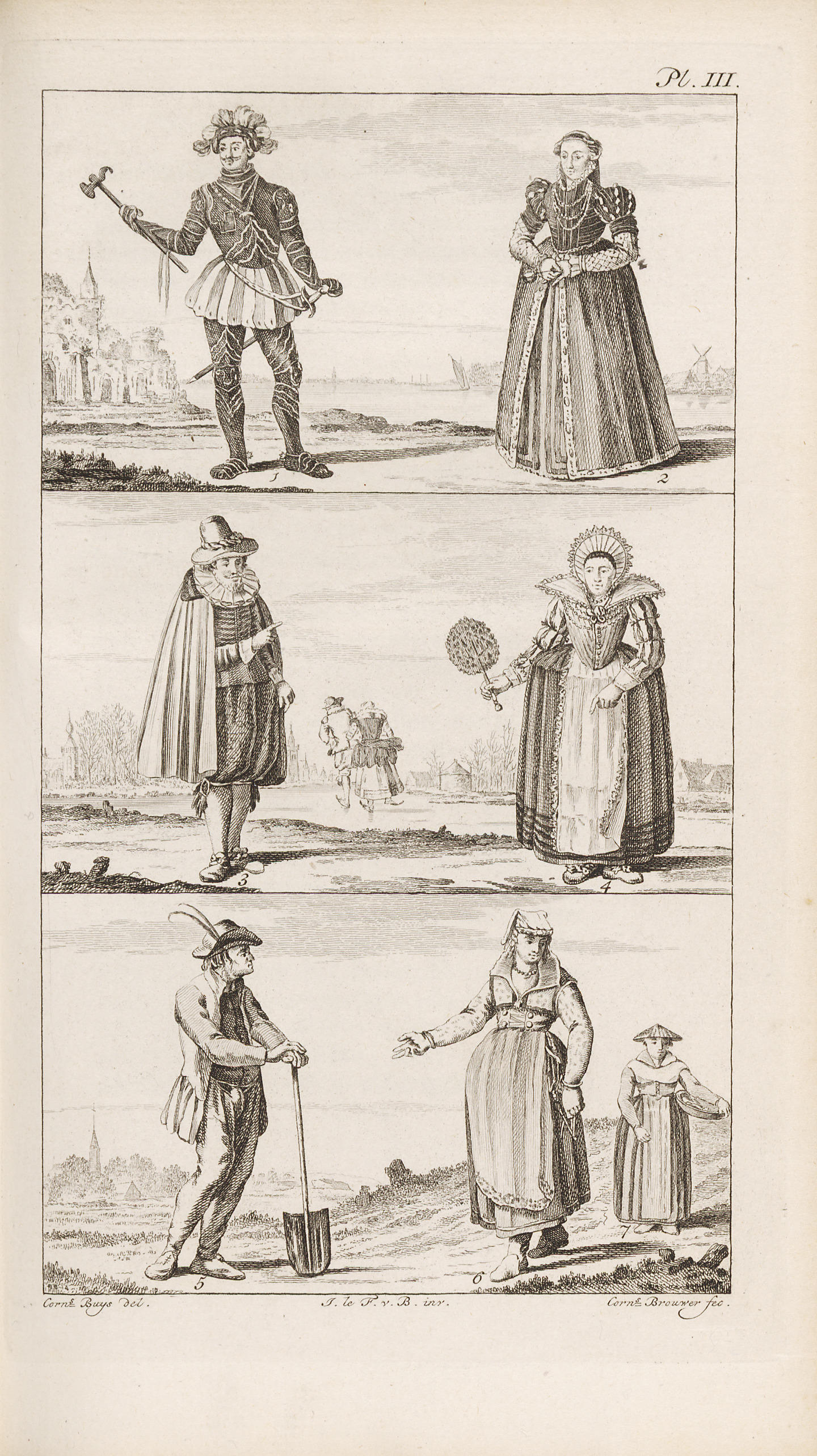 Boven: De kleding van de adel. Midden: Koopman en dame met schaatsende figuurtjes op de achtergrond. Onder: Zuid-Hollandse boeren, eerste helft zeventiende eeuw. Plaat III uit: Natuurlijke historie van Holland : derde deel : eerste stuk / J. le Franq van Berkhey. - Amsterdam : [s.n.], 1776.