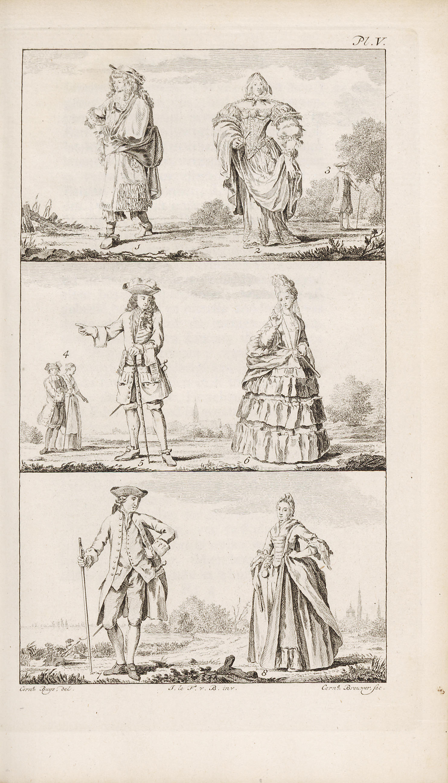 Boven: De hoofse adel van het midden van de zeventiende tot in het begin van de achttiende eeuw. 1 een hoveling, 2 een hofdame, 3 de nieuwe mode. Midden: de kleding van Hollanders vanaf het midden van de achttiende eeuw, 4 ouderwetse burgerman en -vrouw circa 1730-1740, 5 een adellijke man, een Hollandse dame. Onder: ...