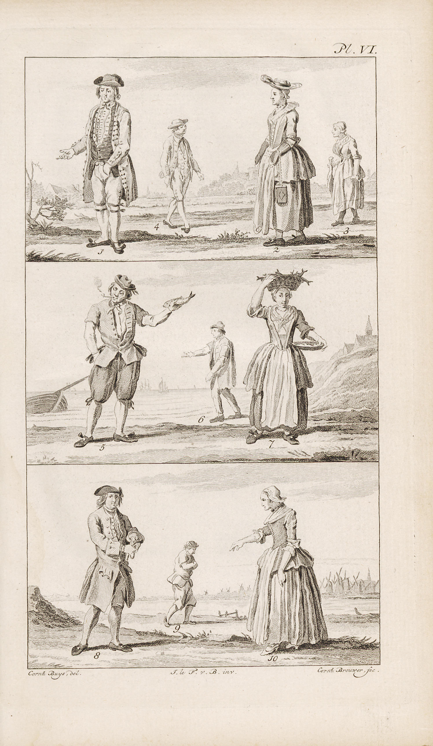 Boven: De deftige boerenstand, 1 een Hollandse boer in zondags pak, 2 een rijke Rijnlandse boerin in kerkdracht, een gewone Zuid-Hollandse boerin met vlasrokken, 4 Zuid-Hollandse boer met wambuis. Midden: Strandbewoners en zeelieden, 5 Hollandse zeeman in werkkleding, 6 Visser en 7 een vissersvrouw zoals zij ter markt gaat. Onder: de dagelijkse kleding van Zaan- ...