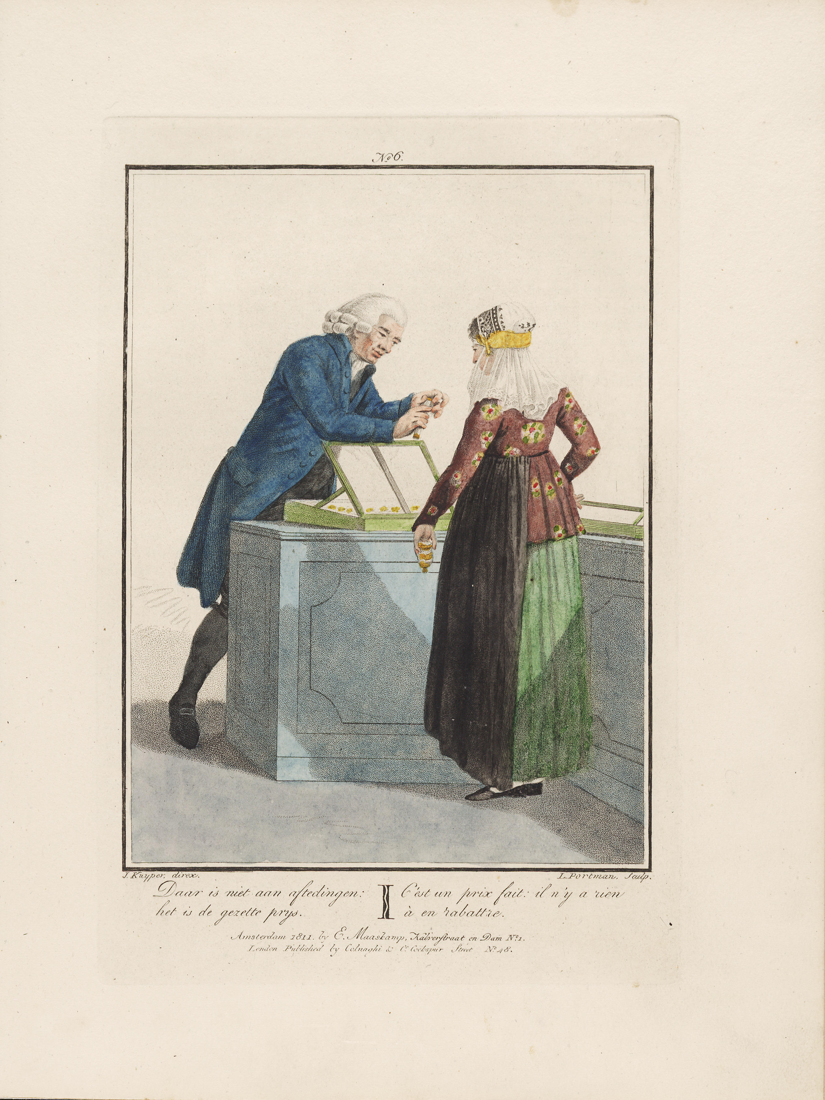 Ingekleurde gravure; Plaat 6 uit: Afbeeldingen van de kleedingen, zeden en gewoonten in de noordelijke provincien van het Koninkrijk der Nederlanden : met den aanvang der negentiende eeuw = Tableaux des habillemens ... / E. Maaskamp - Amsterdam, E. Maaskamp, 1829. De platen zijn eerder in 1803 door Maaskamp uitgegeven. In details en inkleuring zijn ...