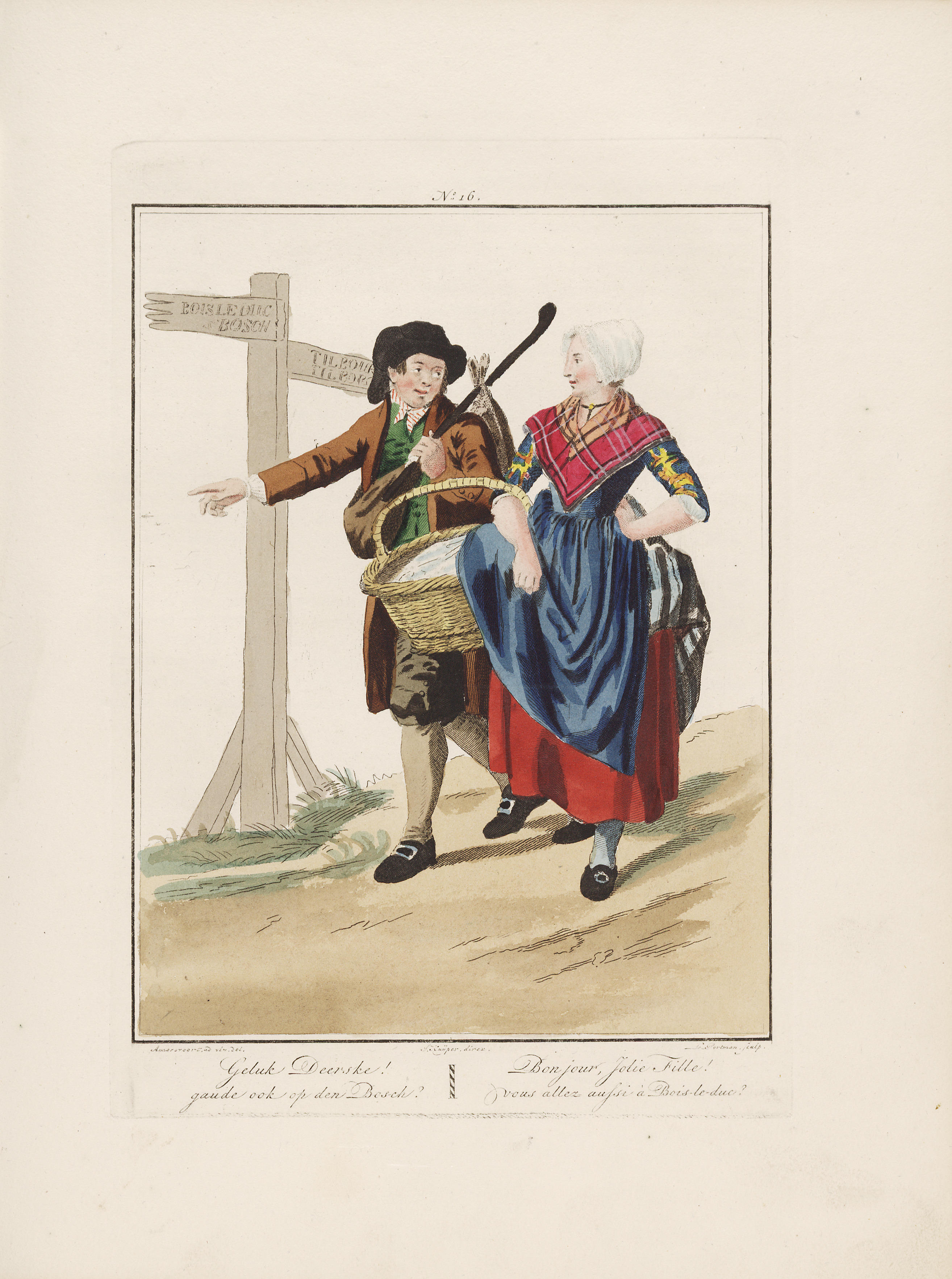 Ingekleurde gravure; Plaat 16 uit: Afbeeldingen van de kleedingen, zeden en gewoonten in de noordelijke provincien van het Koninkrijk der Nederlanden : met den aanvang der negentiende eeuw = Tableaux des habillemens ... / E. Maaskamp - Amsterdam, E. Maaskamp, 1829. De platen zijn eerder in 1803 door Maaskamp uitgegeven. In details en inkleuring zijn ...