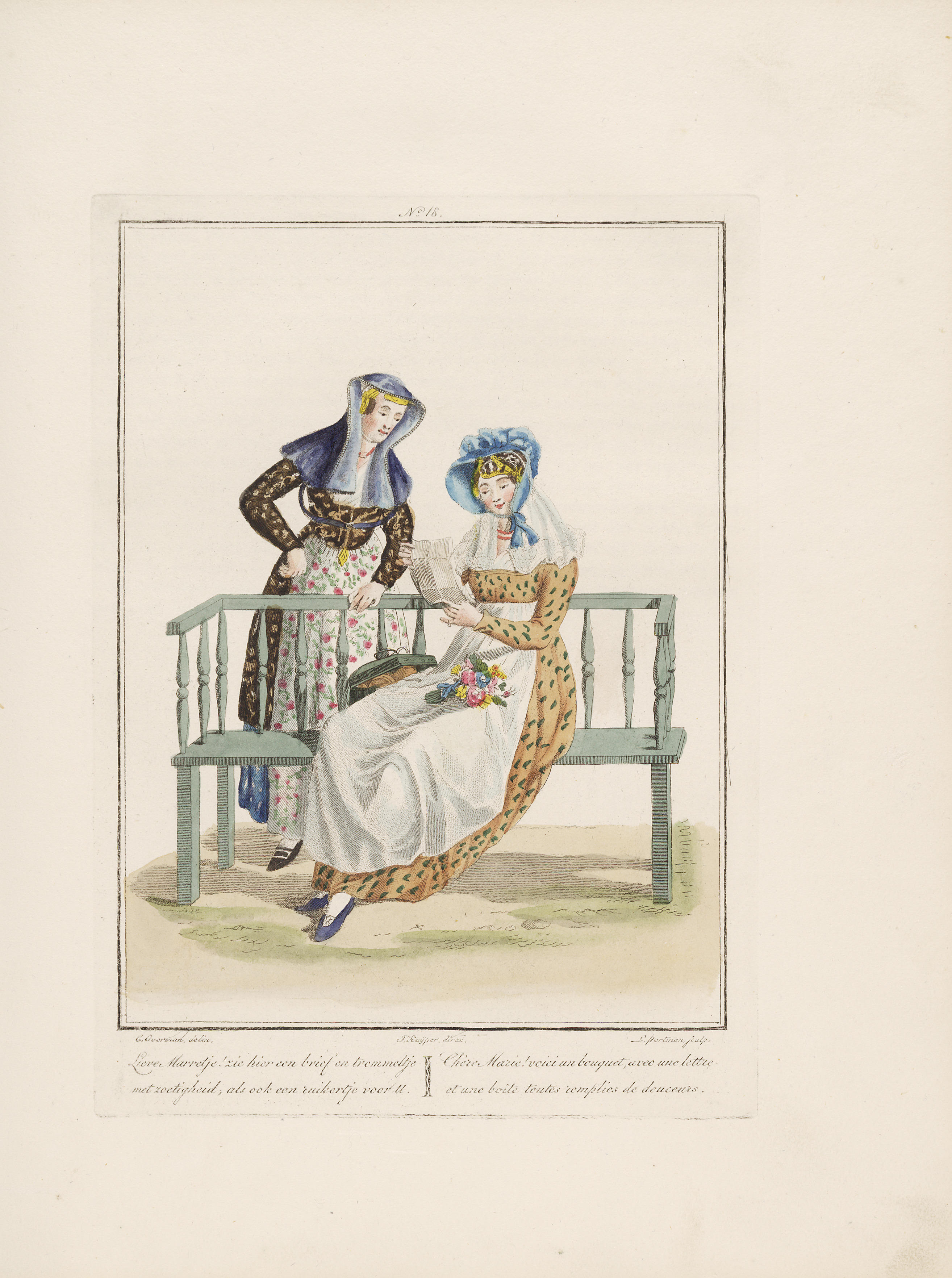 Ingekleurde gravure; Plaat 18 uit: Afbeeldingen van de kleedingen, zeden en gewoonten in de noordelijke provincien van het Koninkrijk der Nederlanden : met den aanvang der negentiende eeuw = Tableaux des habillemens ... / E. Maaskamp - Amsterdam, E. Maaskamp, 1829. De platen zijn eerder in 1803 door Maaskamp uitgegeven. In details en inkleuring zijn ...